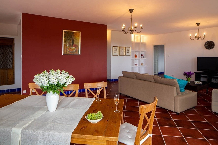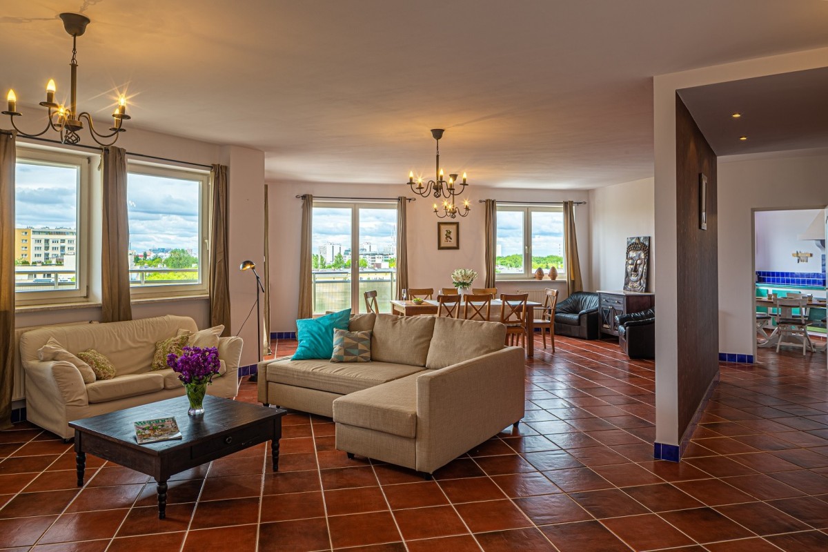 Duży salon z wielkimi oknami z widokiem na Warszawę