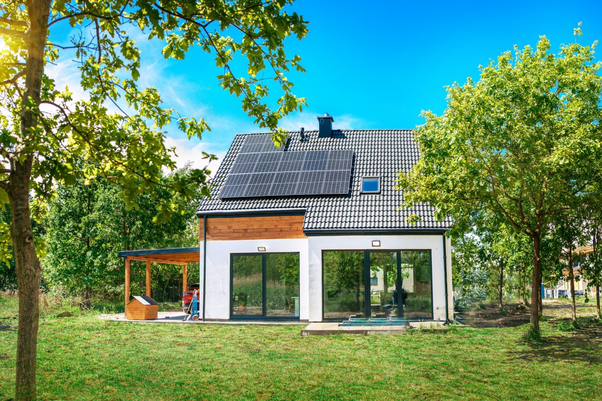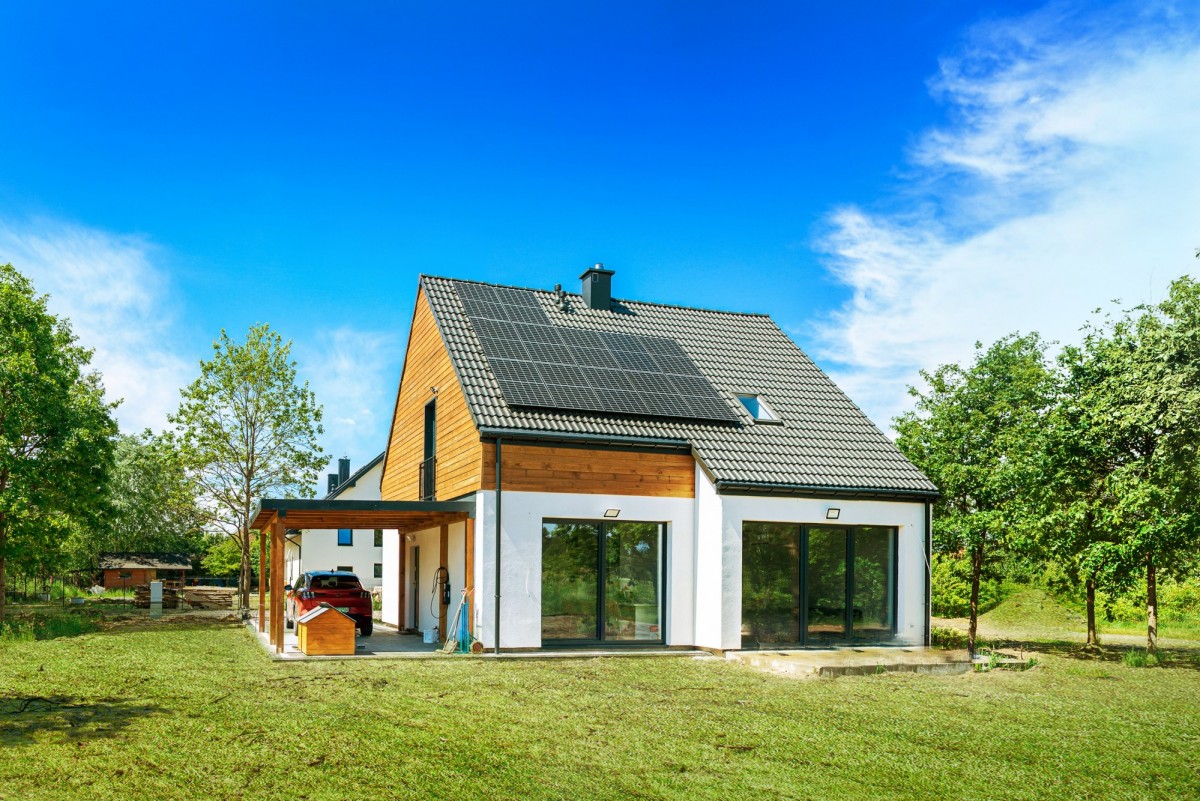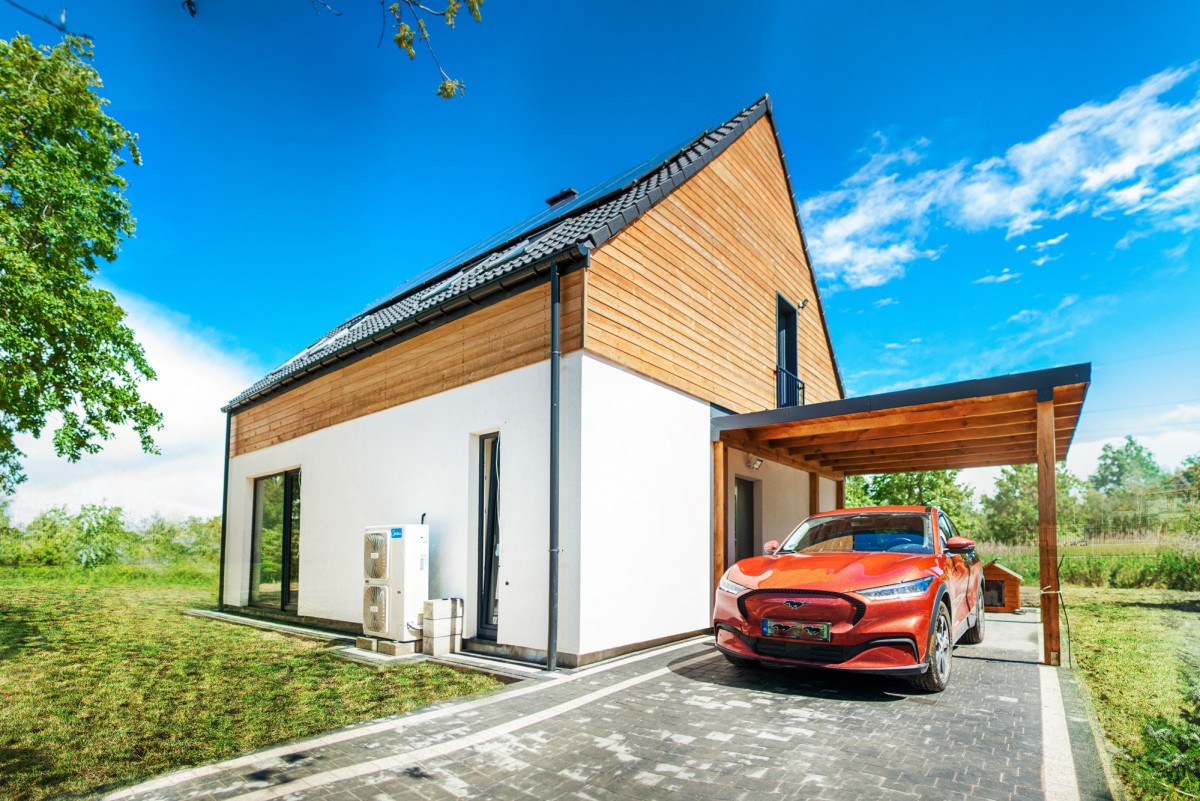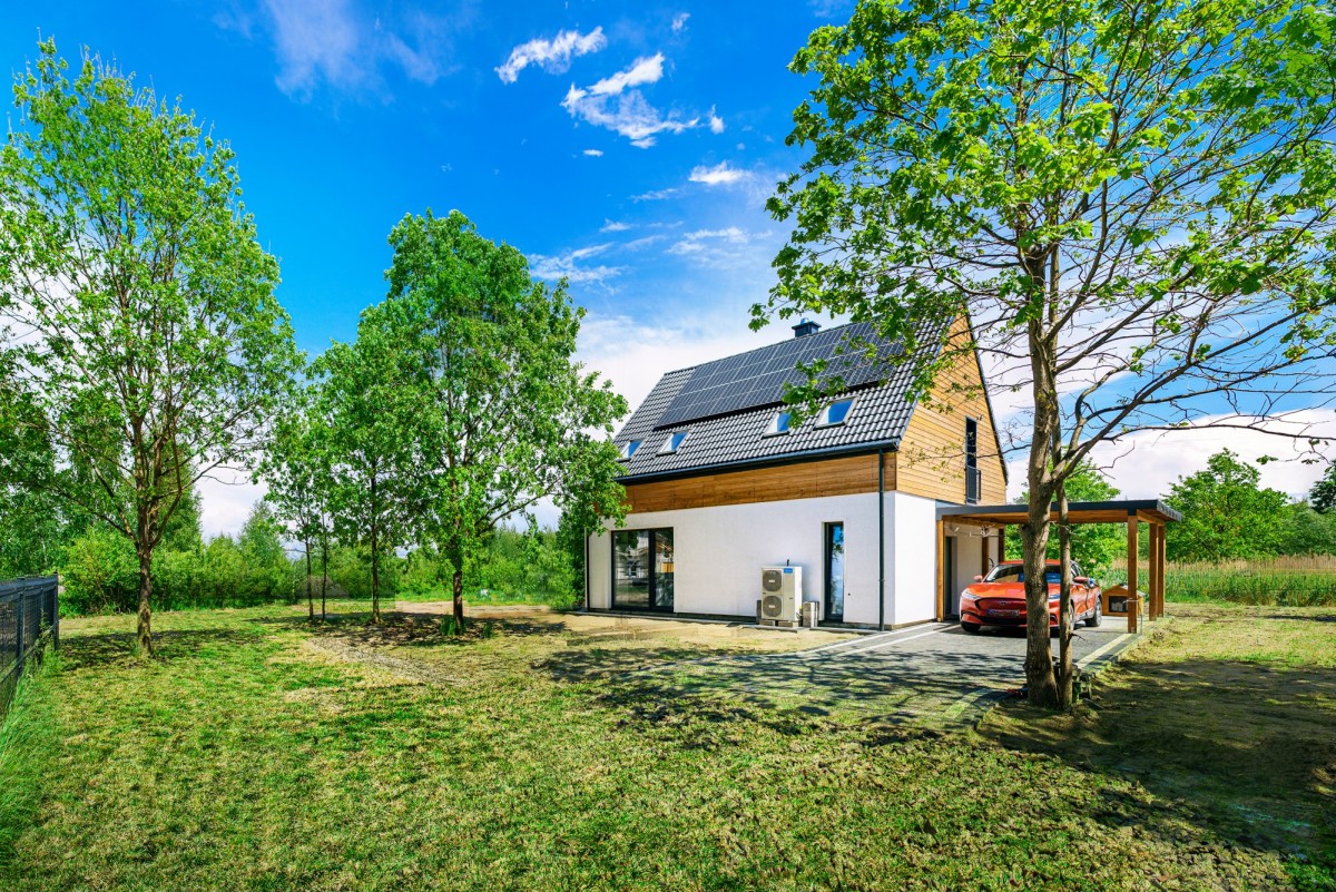 :: Krótko: Oferujemy nowoczesny dom jednorodzinny w miejscowości Baszkówka, zaledwie 15 minut od Warszawy, o powierzchni 115 m2 na działce 709 m2, z pompą ciepła.