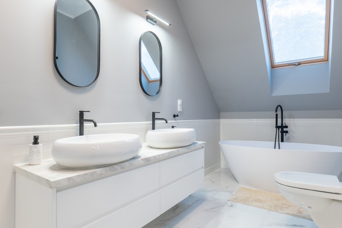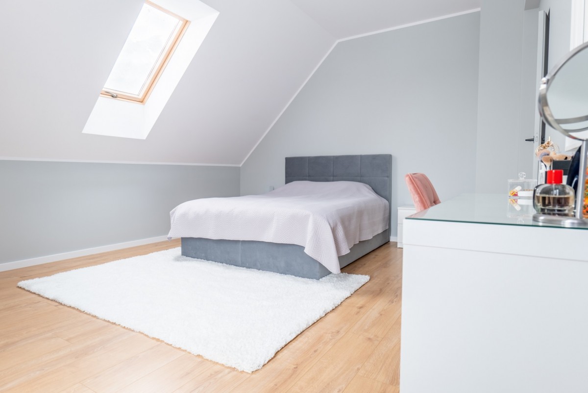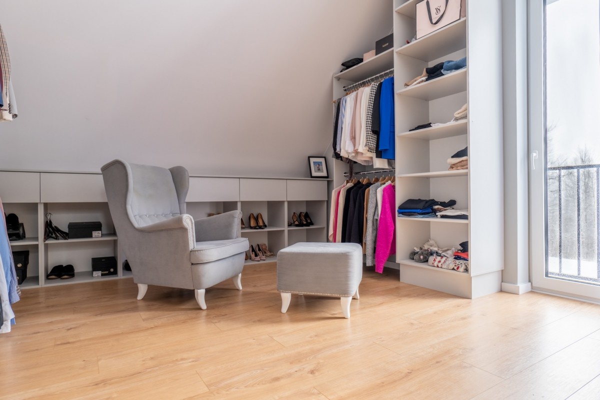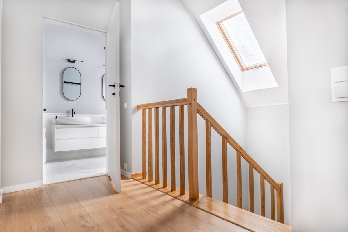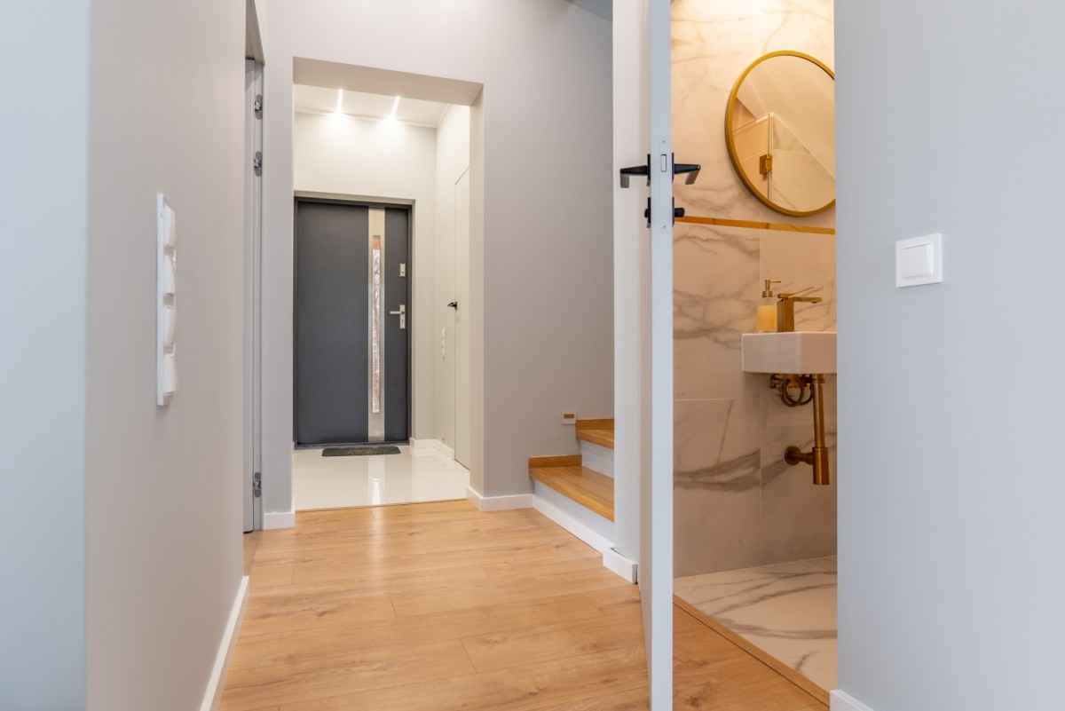 :: Rozkład? Na parterze znajduje się łazienka z prysznicem, salon z aneksem kuchennym, pomieszczenie gospodarcze, wiatrołap oraz pokój gościnny lub biuro. Na piętrze znajdują się dwie sypialnie, garderoba oraz duża łazienka z wanną.