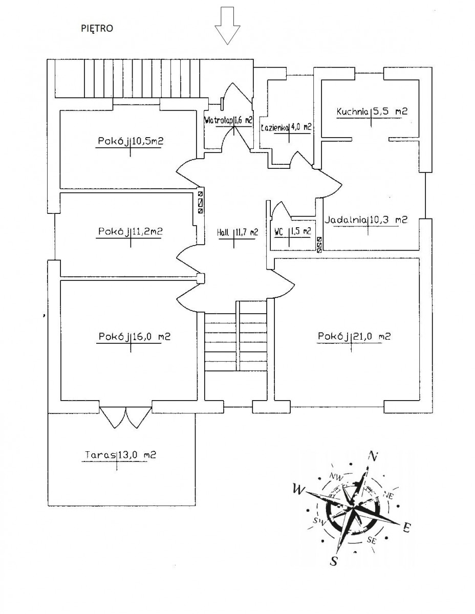 Na piętrze znajdują się cztery pokoje, w tym jeden z wyjściem na taras, kuchnia z jadalnią, łazienka oraz oddzielna toaleta.