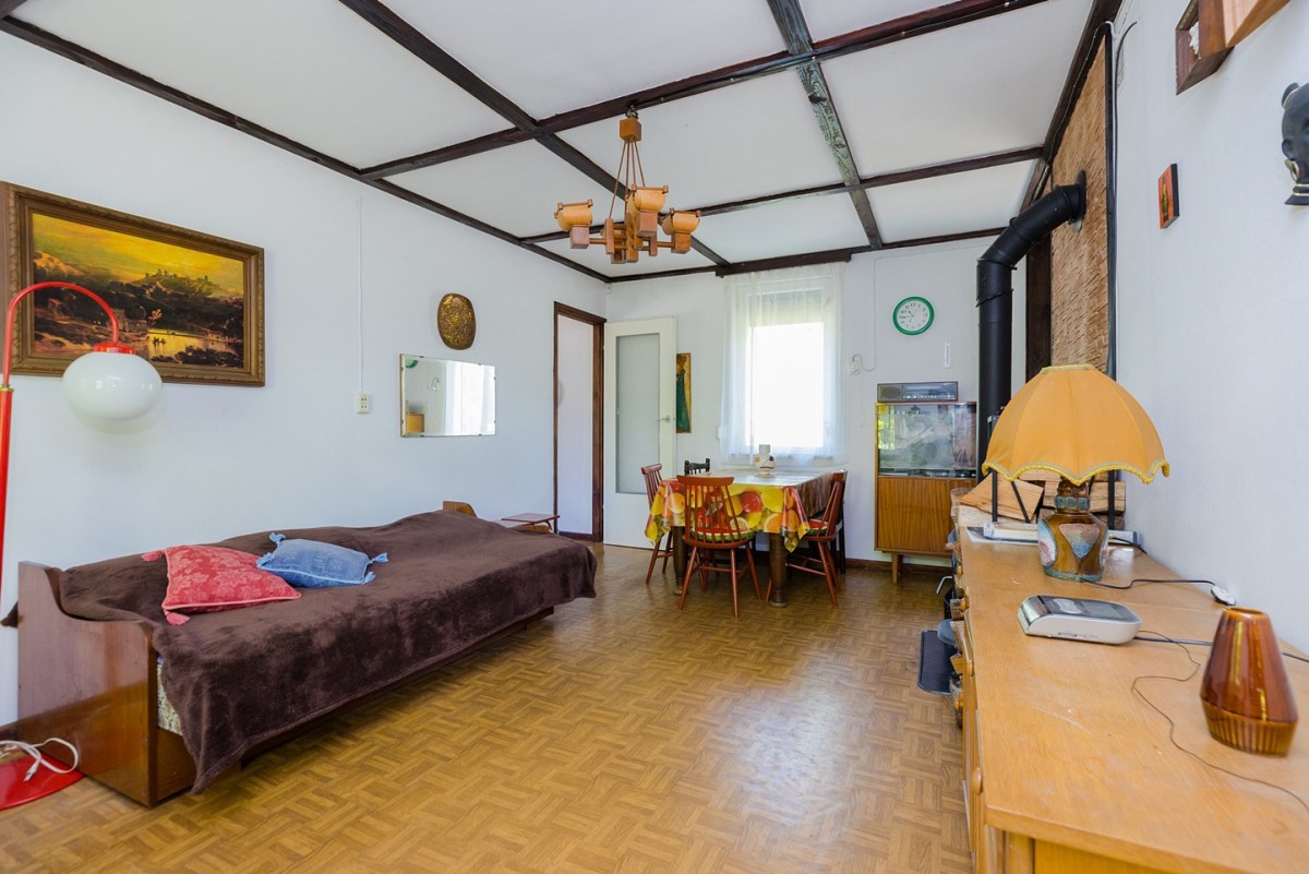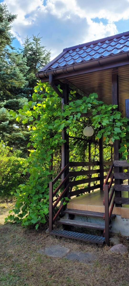 Domek składa się z pokoju dziennego, dwóch sypialni, kuchni i łazienki z małą wanną. Wchodzi się do niego przez urokliwą werandę, z której roztacza się widok na całą działkę o powierzchni 1071 m2.