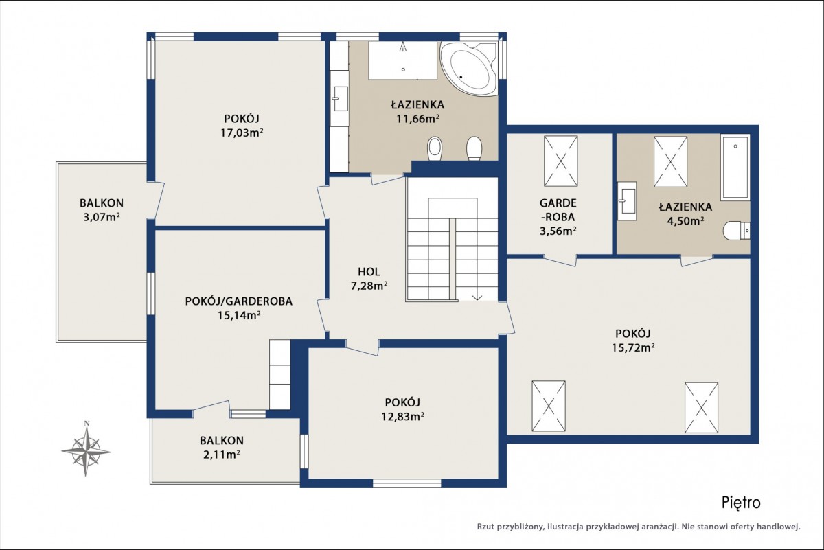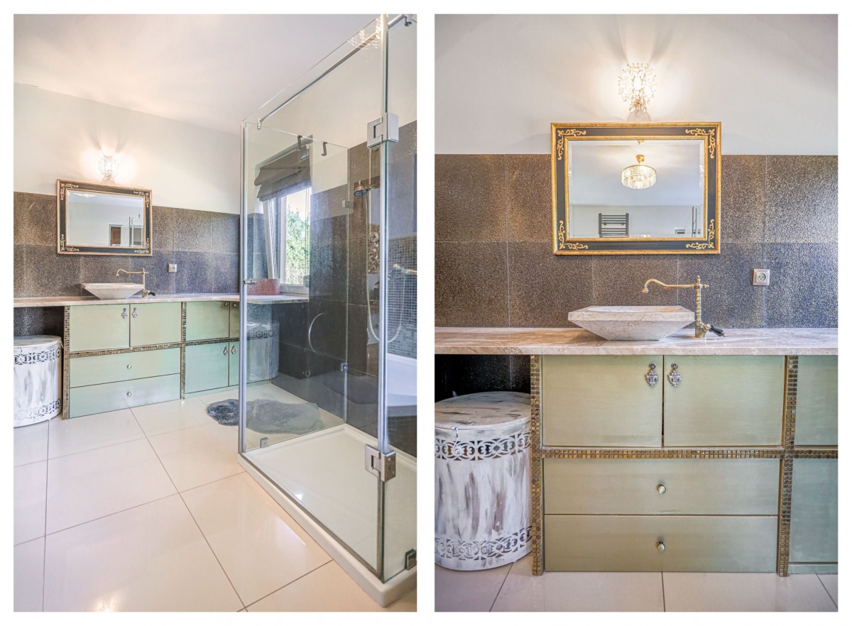 Łazienka na piętrze wyposażona jest w toaletę, prysznic, wannę, umywalkę i piękny granitowy blat. Dodatkową powierzchnią stanowią dwa balkony.
