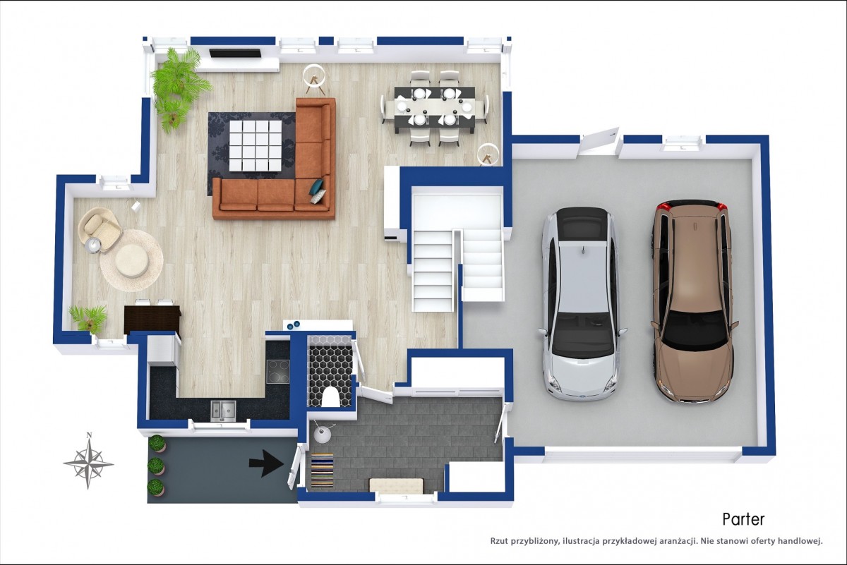 1. Garaż z bramą garażową na dwa auta oraz dwoma miejscami parkingowymi przed garażem.