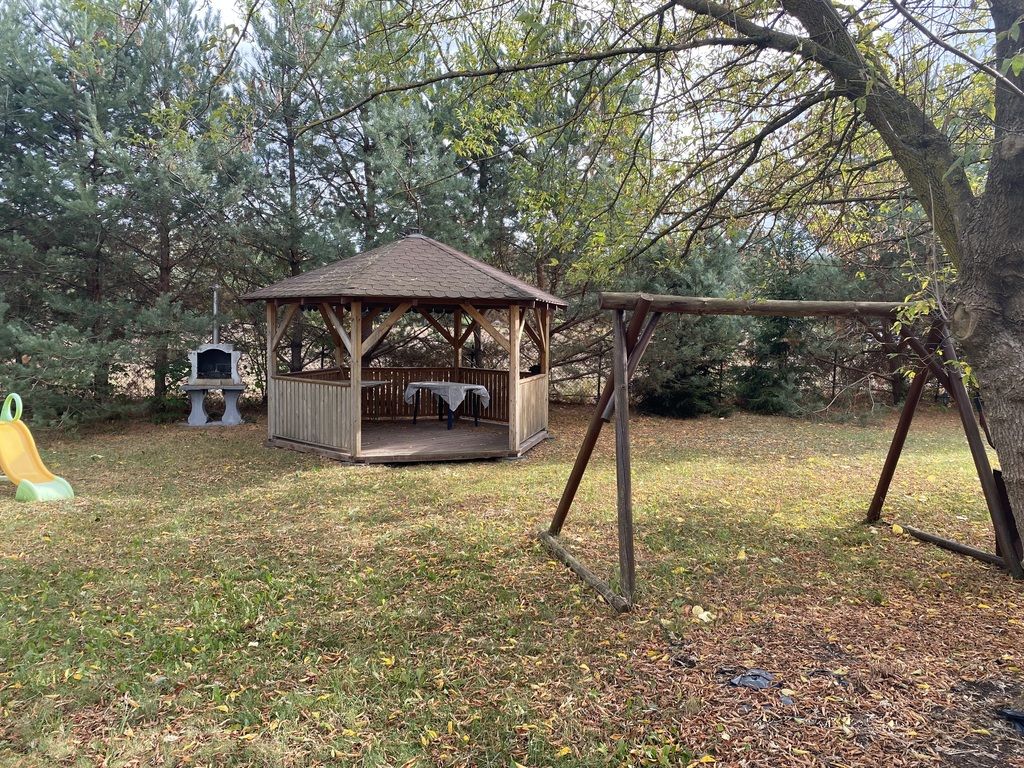 Działka zadbana z krzewami i drewnianą altanką. Wyposażenie domu w cenie nieruchomości.