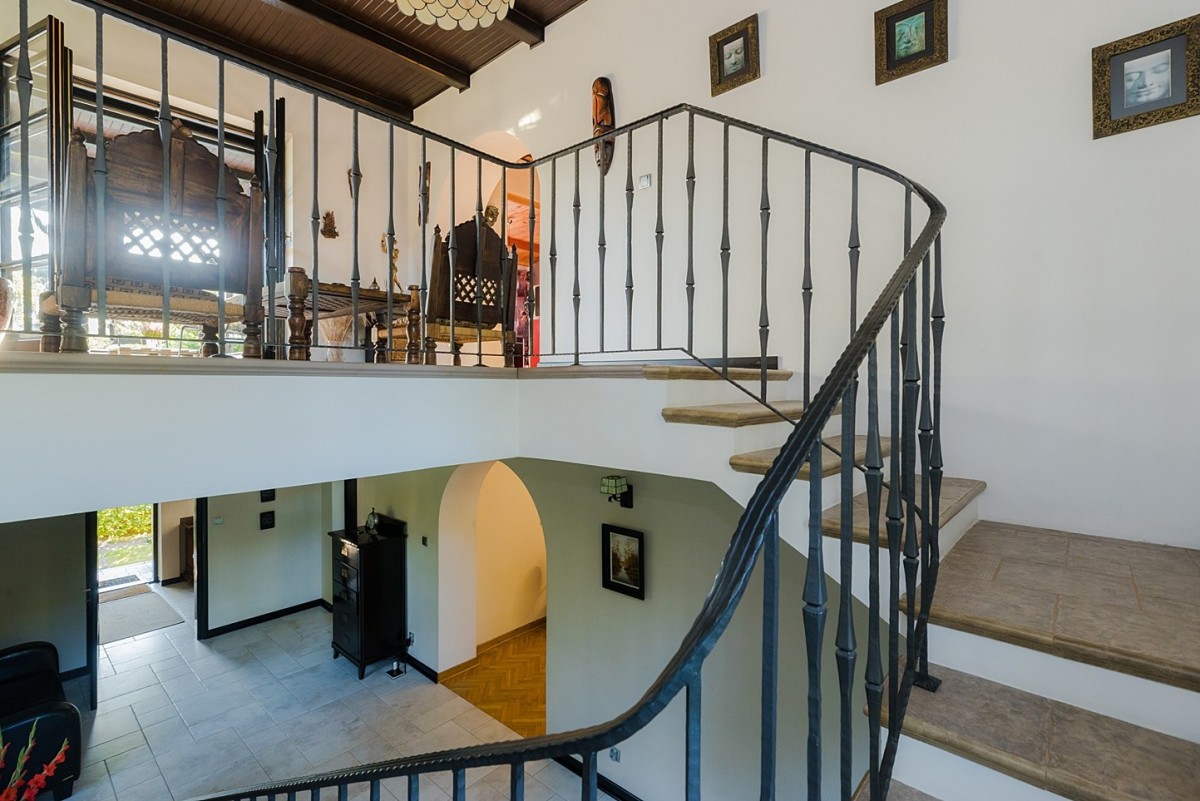 Na pierwsze piętro prowadzą schody ze stylową kutą balustradą.