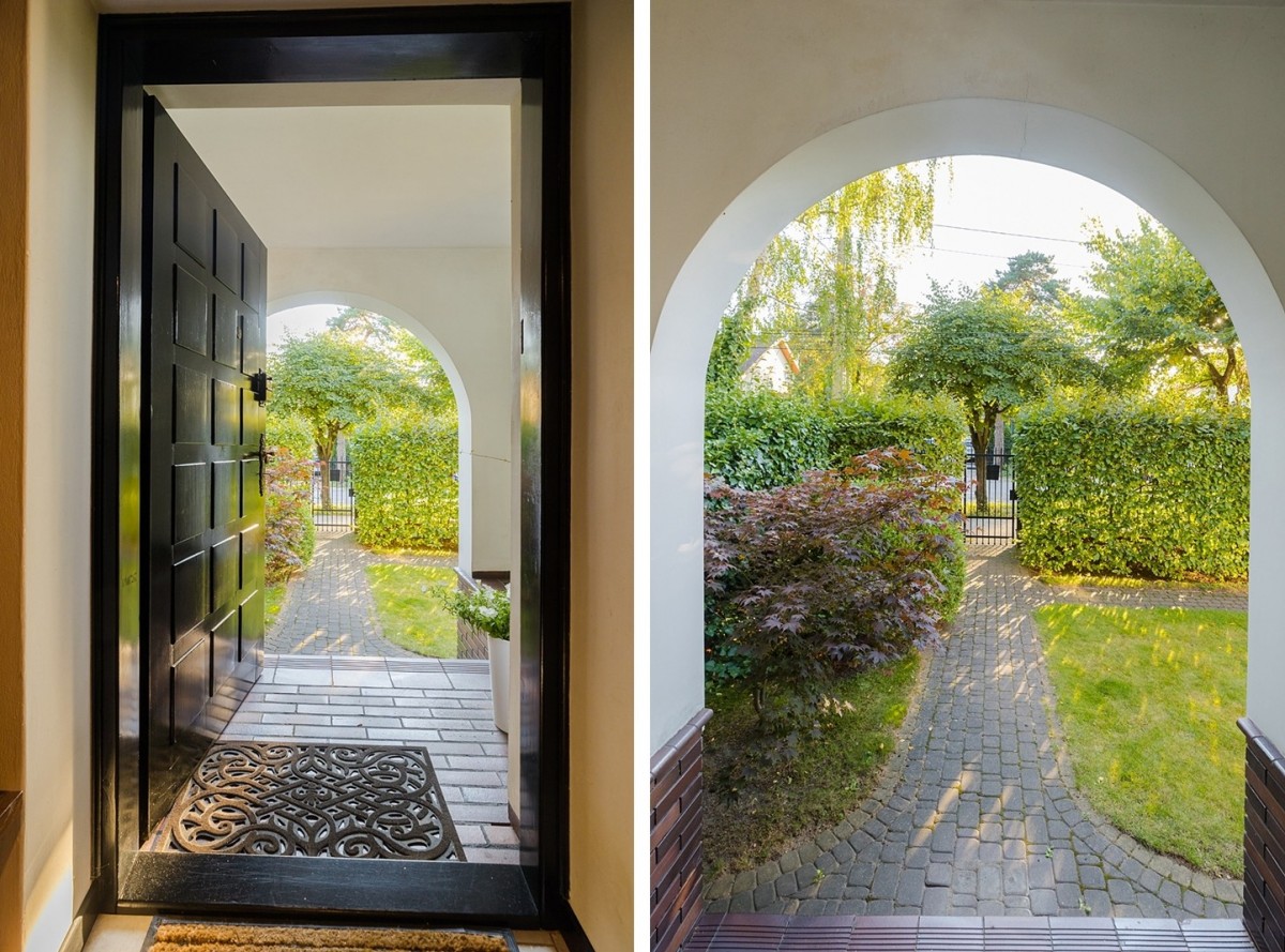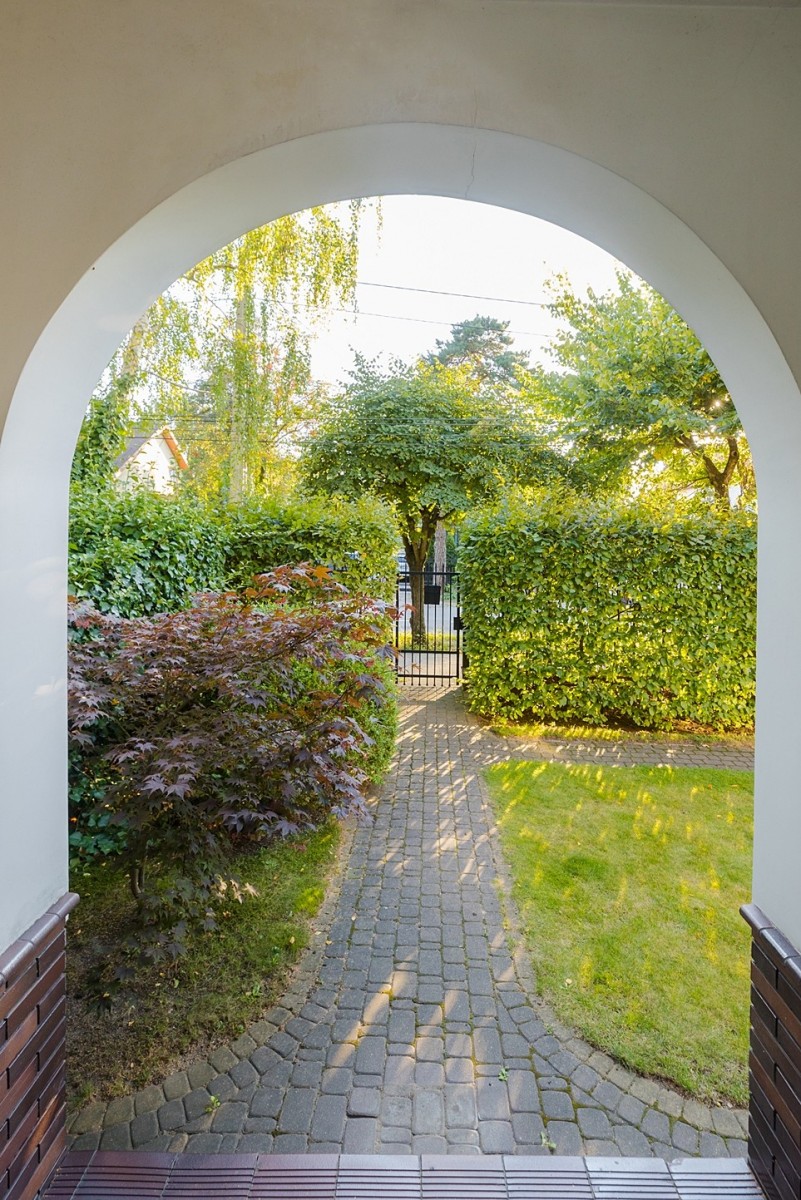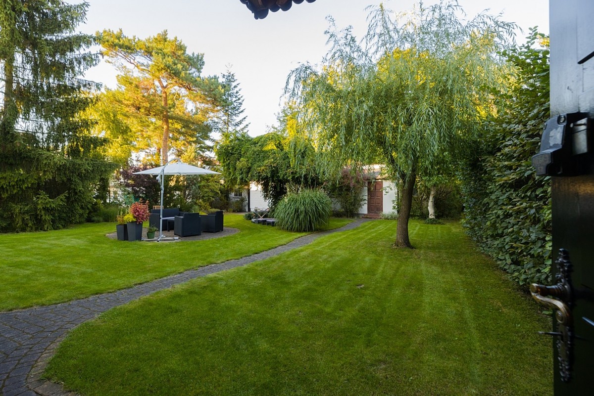 Zadbany trawnik, ścieżki z dekoracyjnej kostki oraz drzewa, które chronią przed słońcem i spojrzeniami przechodniów.