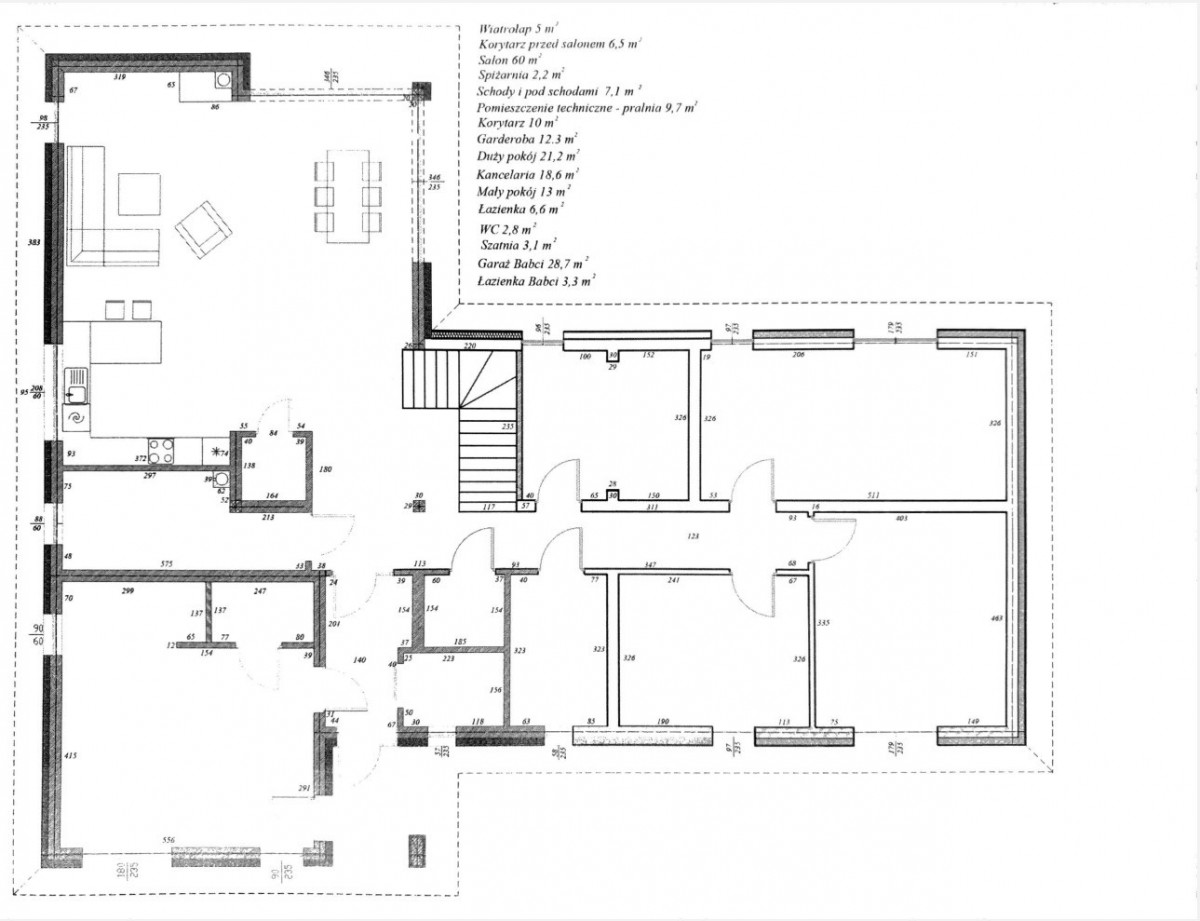 - salon z częścią kuchenną, jadalną i wypoczynkową z wyjściem na taras i ogród 60m2,