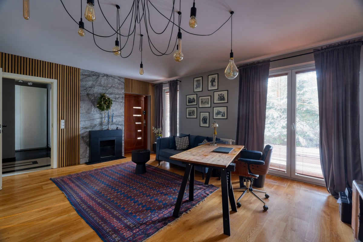 Wykończony ze smakiem, zarówno z zewnątrz jak i w środku, 2-kondygnacyjny budynek mieszkalny. Jego układ na działce i rozkład pomieszczeń dają poczucie dużej prywatności. W każdym pokoju wnętrza są dobrze doświetlone i jasne, dzięki bardzo dużym oknom, z których roztacza się piękny widok za drzewa. W centralnej części domu znajduje się gustownie wykończony, 60-metrowy salon połączony z kuchnią i częścią jadalną. Uwagę przykuwa stylowy kominek znajdujący się w strefie wypoczynkowej. Przedłużeniem salonu jest duży, funkcjonalny taras wypoczynkowy i piękny ogród.