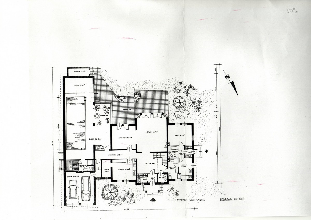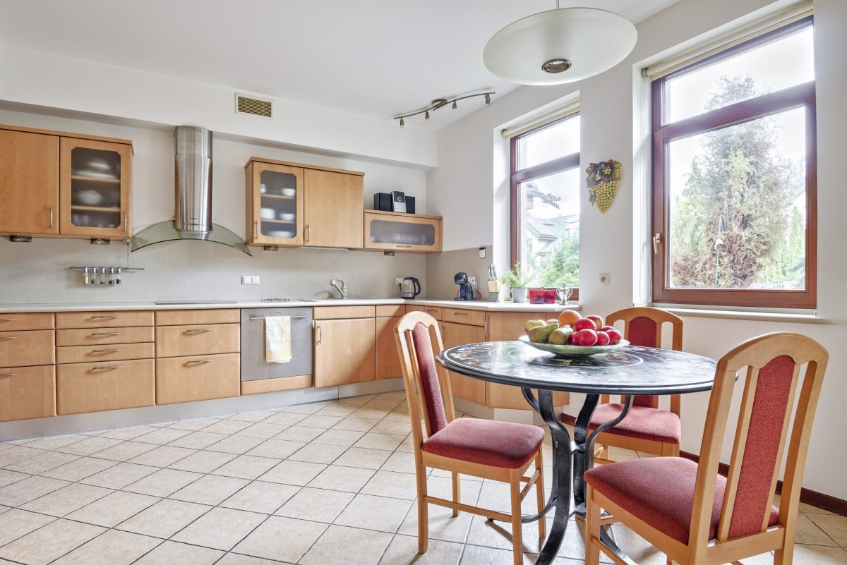 Został wybudowany w 2002 roku z Ytongu (beton komórkowy). Jego największym atutem jest bardzo przestronny salon (41,7 m2), który jest otwarty na piękną jadalnie (20,3 m2) z dużym stołem. Dzięki pięknym dużym mahoniowym oknom i bardzo zadbanemu parkietowi cała ta przestrzeń pomimo swych rozmiarów jest bardzo przyjemna i przytulna. Kolejnym elementem, który sprawia, że część dzienna jest tak przyjazna to duży kominek. Niedaleko jadalni znajduje się spora osobna kuchnia z oknem (17,7 m2). Każda rodzina doceni fakt, że obok mieści się spiżarnia (5,8 m2).