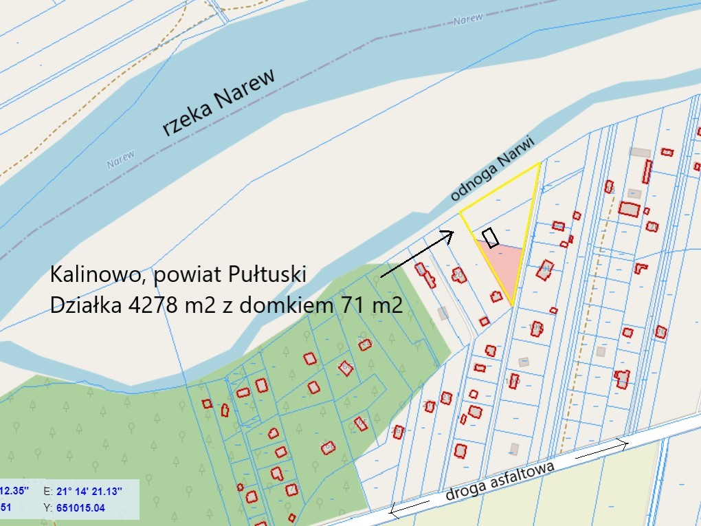 Powierzchnia działki to prawie 4300 m2, w kształcie trójkąta.