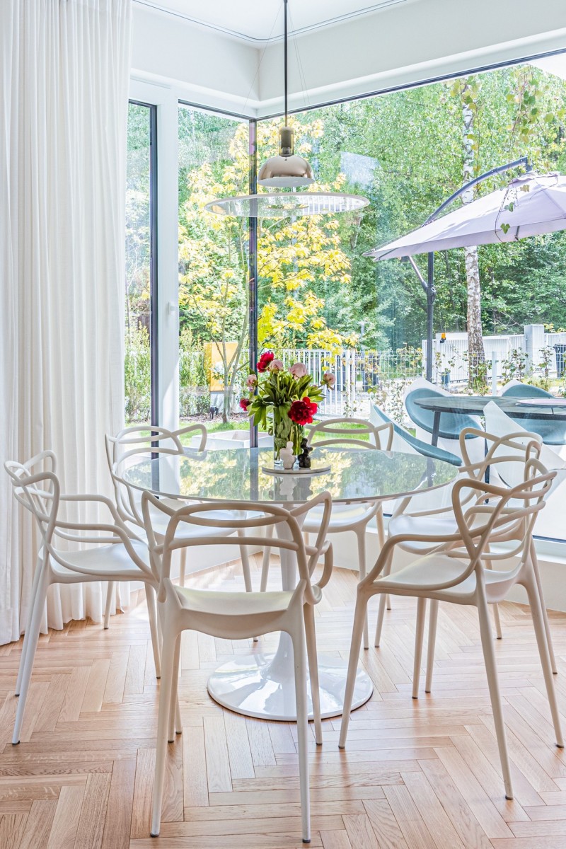 Projekt który powstał miał być nowoczesny i wygodny dla domowników. Dużo przeszkleń i okien zapewnia doskonałe doświetlenie wysokich na 3 metry pomieszczeń.