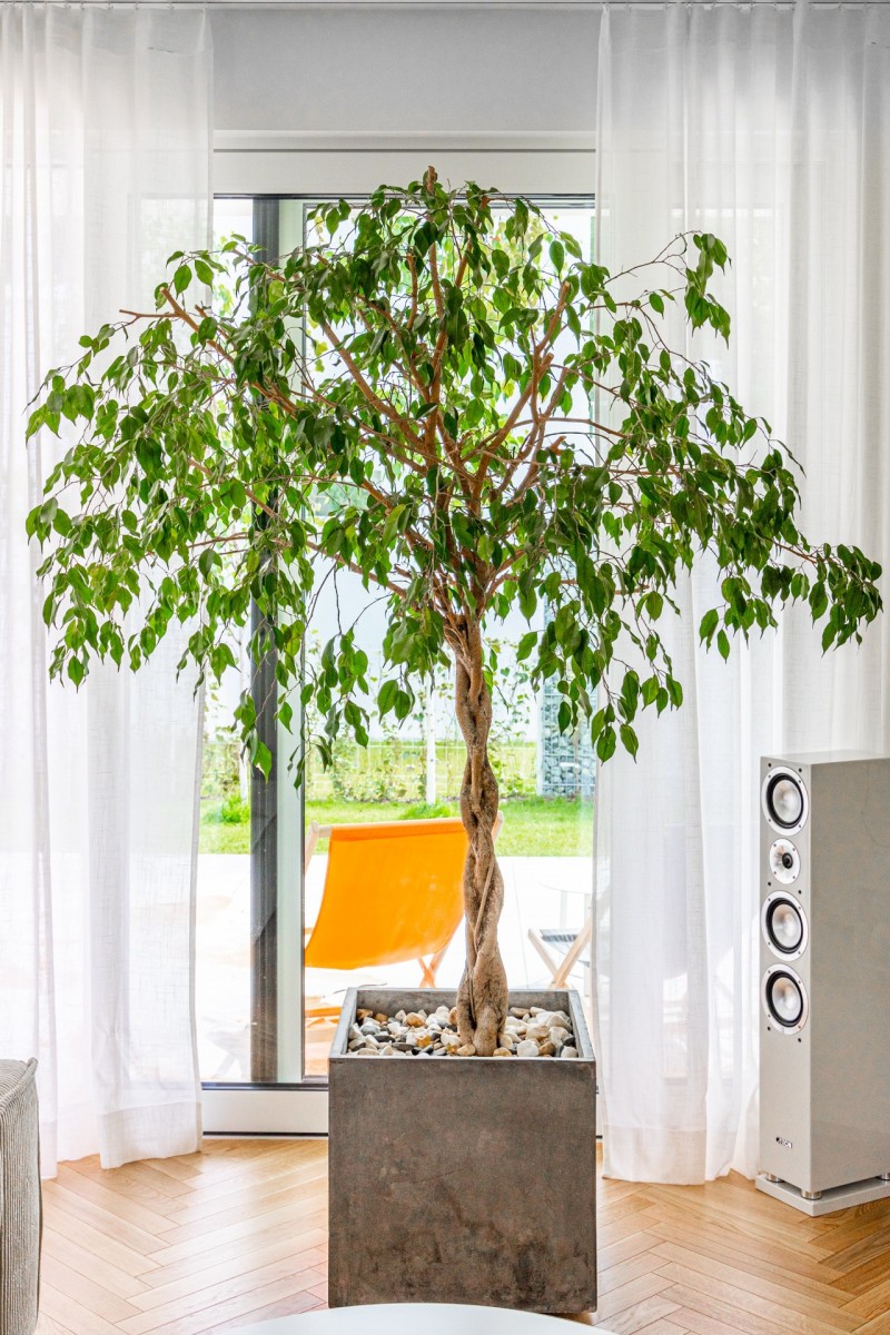 Wnętrze domu, rozmieszczenie pomieszczeń, ich aranżacja oraz przeznaczenie jest w każdym szczególe przemyślane, łączy w sobie koncepcję ‘otwartego planu’ pozwalającą na płynne połączenie poszczególnych pokoi, oraz ogrodu w spójną, przenikającą się całość. Odwiedzając to wyjątkowe miejsce nie można oprzeć się atmosferze relaksu i wszechobecnego spokoju, bliskości z naturą.