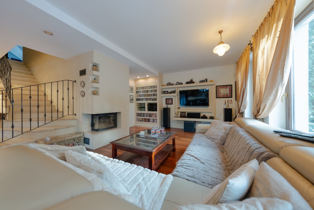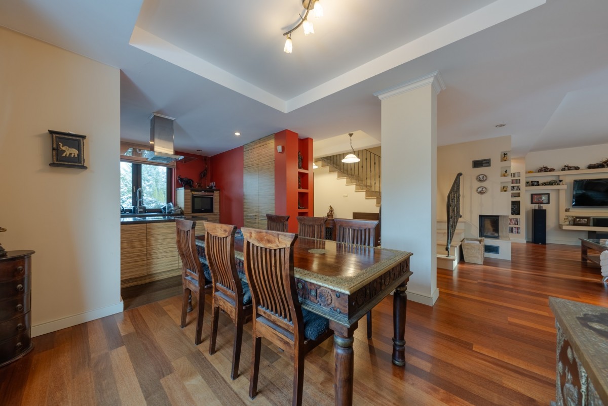- Bardzo przestronny salon z dużym narożnym kominkiem połączony z wyjściem na taras