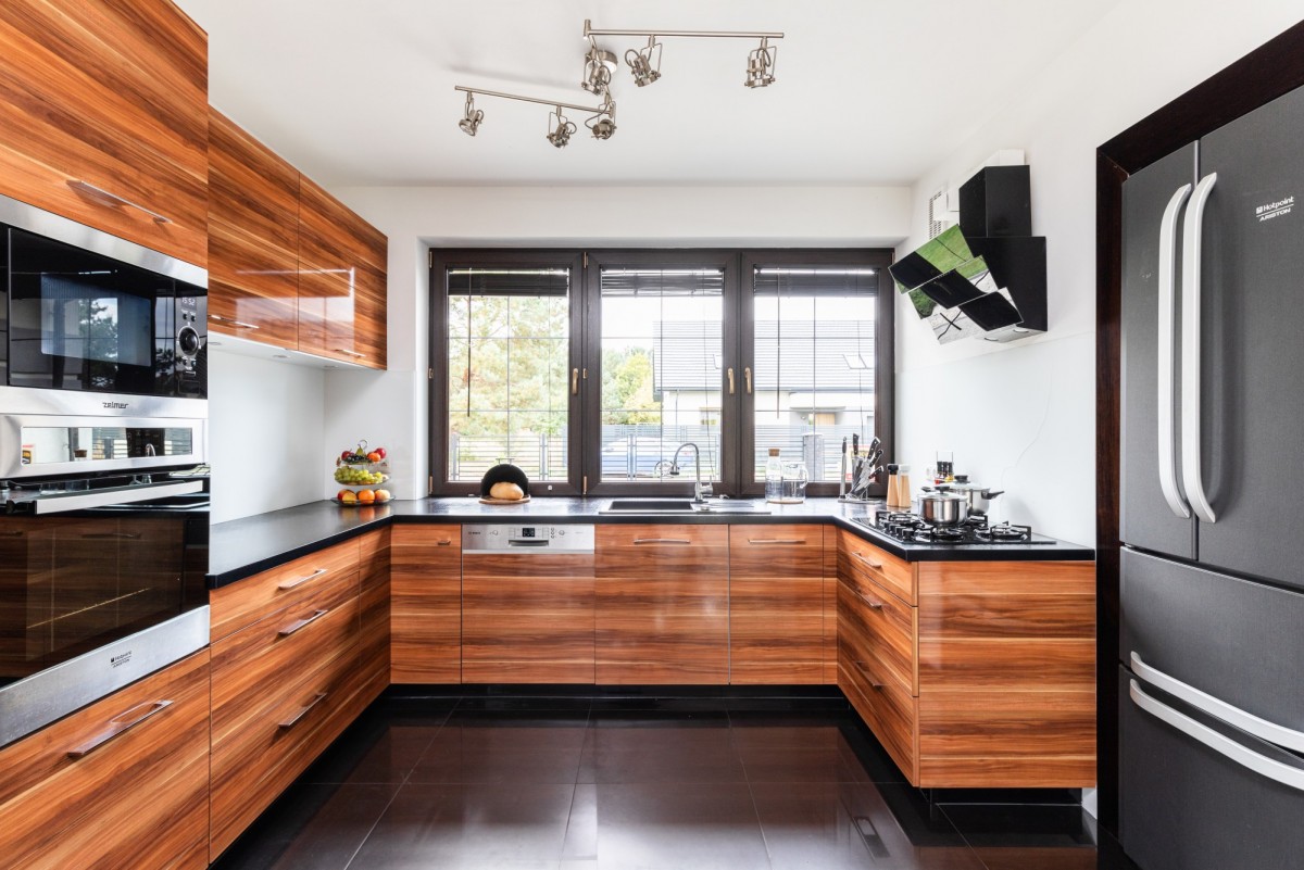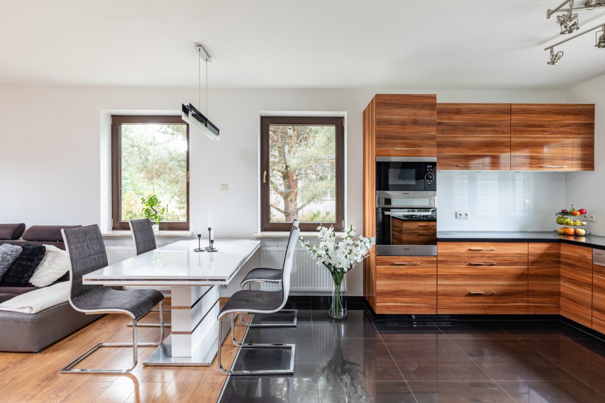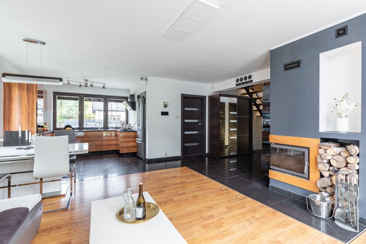 - Otwarta kuchnia, która jest całkowicie otwarta na pokój dzienny, co sprzyja swobodnemu przemieszczaniu się i integracji podczas gotowania i spożywania posiłków.