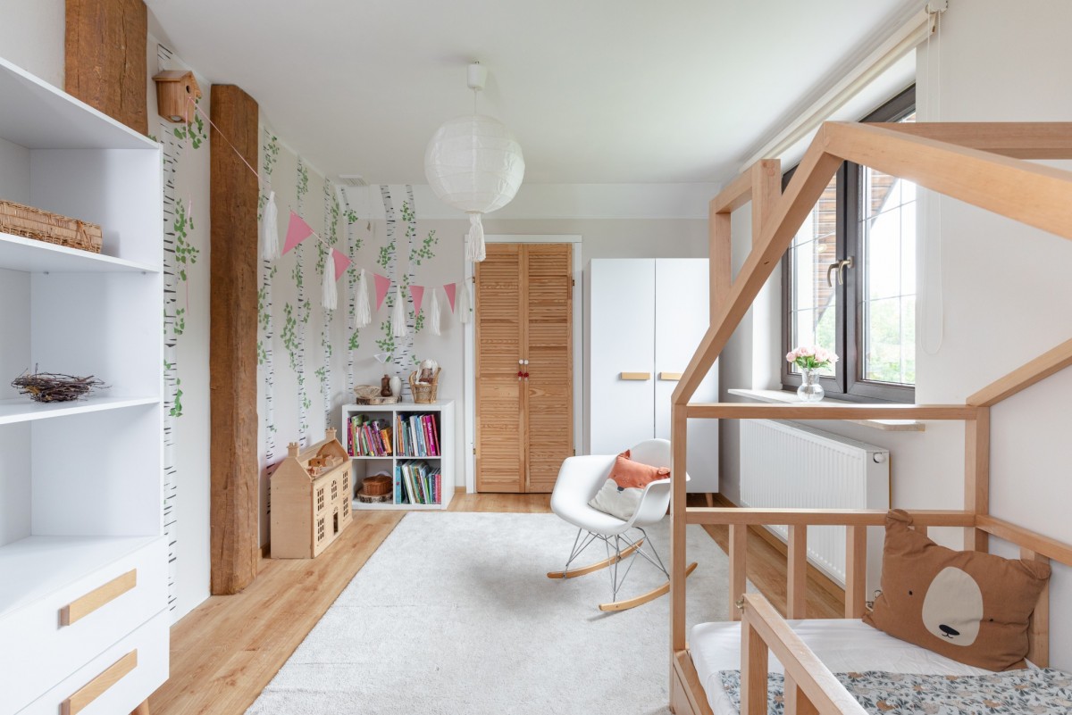 - Pokój dziecięcy, z niewielką garderobą, co zapewnia wygodne miejsce do przechowywania ubrań i akcesoriów.