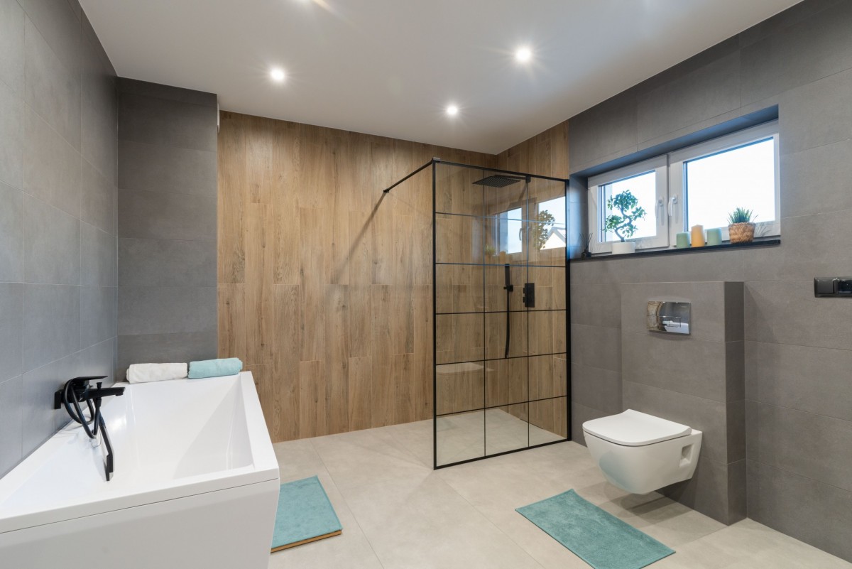 - salon kąpielowy z oknem, wanną i prysznicem o powierzchni 11,34 m2