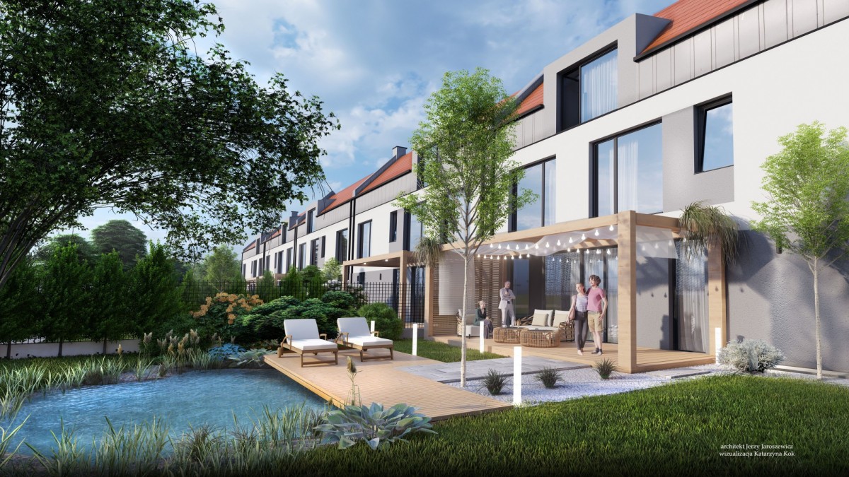 Osiedle charakteryzuje się nowoczesną architekturą domów w zabudowie szeregowej. Duże panoramiczne okna zapewniają obfite światło naturalne, a kontrastowa kolorystyka wykończenia w połączeniu z drewnem nadaje nieruchomości wyjątkowy charakter.