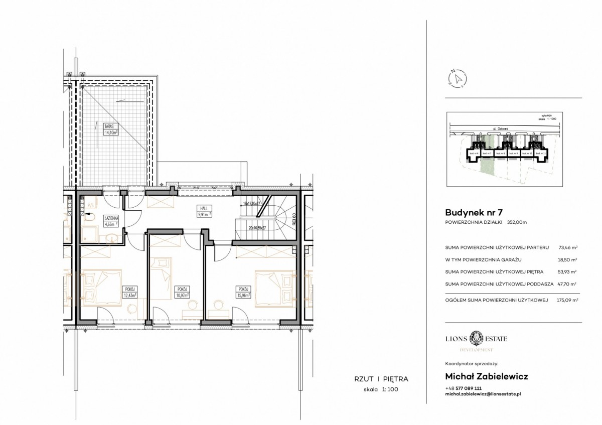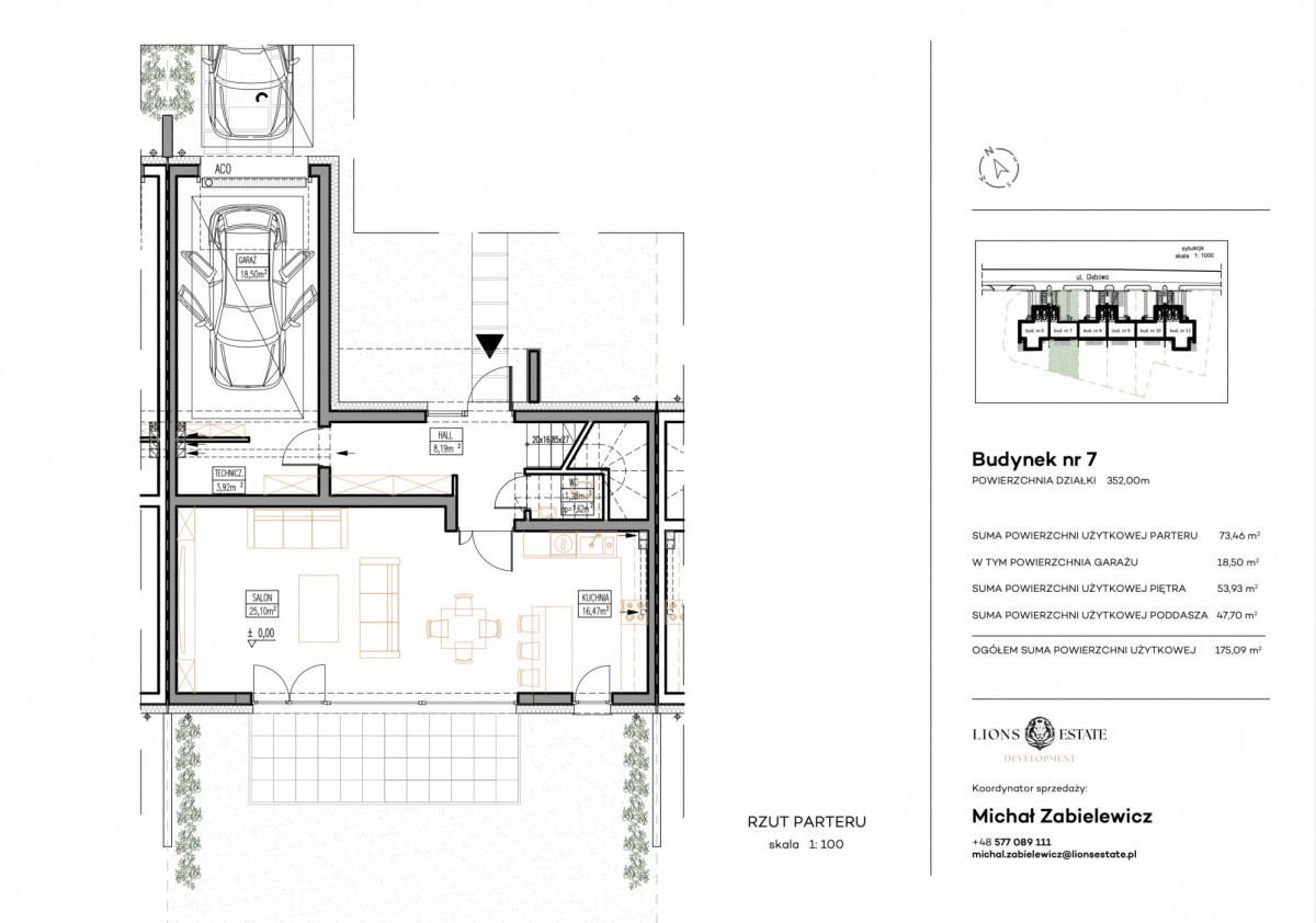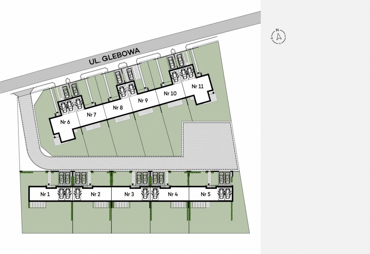 Dom znajdują się na przestronnej działce o powierzchni 352 m2. Miejsca parkingowe zaplanowano zarówno na zewnątrz domów, jak i w indywidualnym garażu, gwarantując prywatność i komfort mieszkańcom.