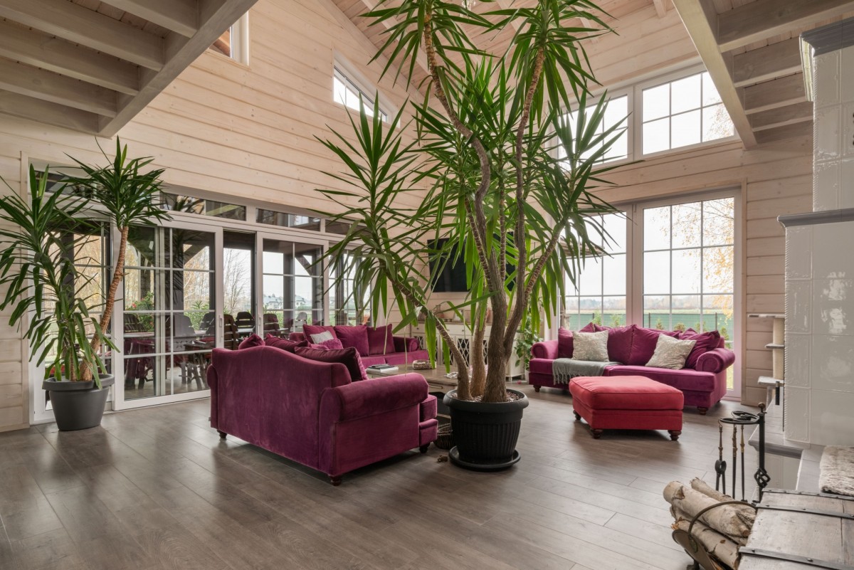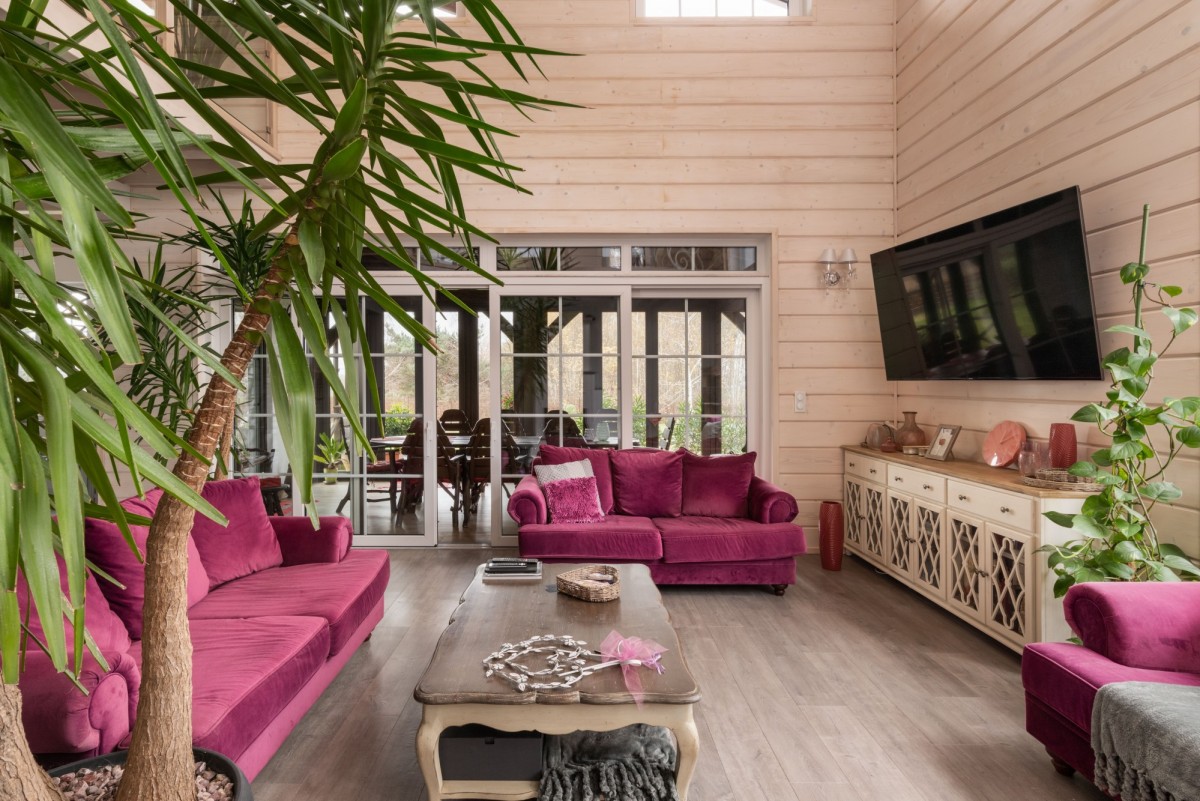 Część dzienna, doskonale doświetlony, sklepiony na wysokości dachu salon z wyjściem do oranżerii i ogrodu.