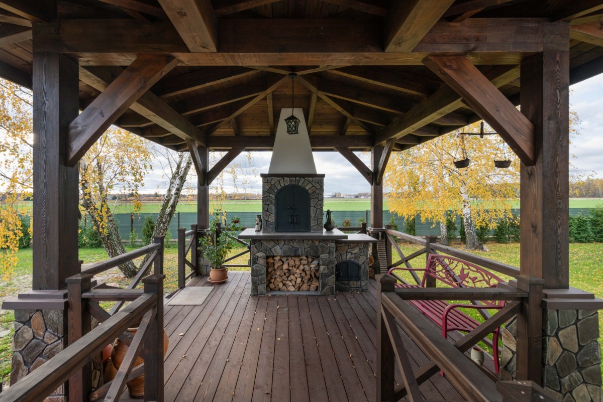 Z oranżerii zadaszonym przejściem dostaniemy się do wiaty z murowanym grillem.