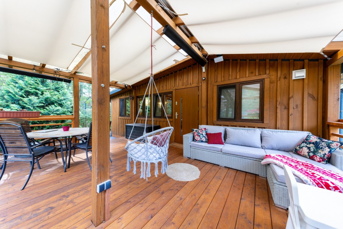 • Sercem domu jest duży, zadaszony taras (30m2) - miejsce relaksu i spotkań towarzyskich, a nawet gotowania w sezonie dla przyjaciół. Zaopatrzony w panele grzewcze na podczerwień dzięki czemu można na nim przebywać o każdej pogodzie i porze dnia. Do tego wielopunktowe oświetlenie z nastrojowym działaniem - lampy LED zmieniające kolor.