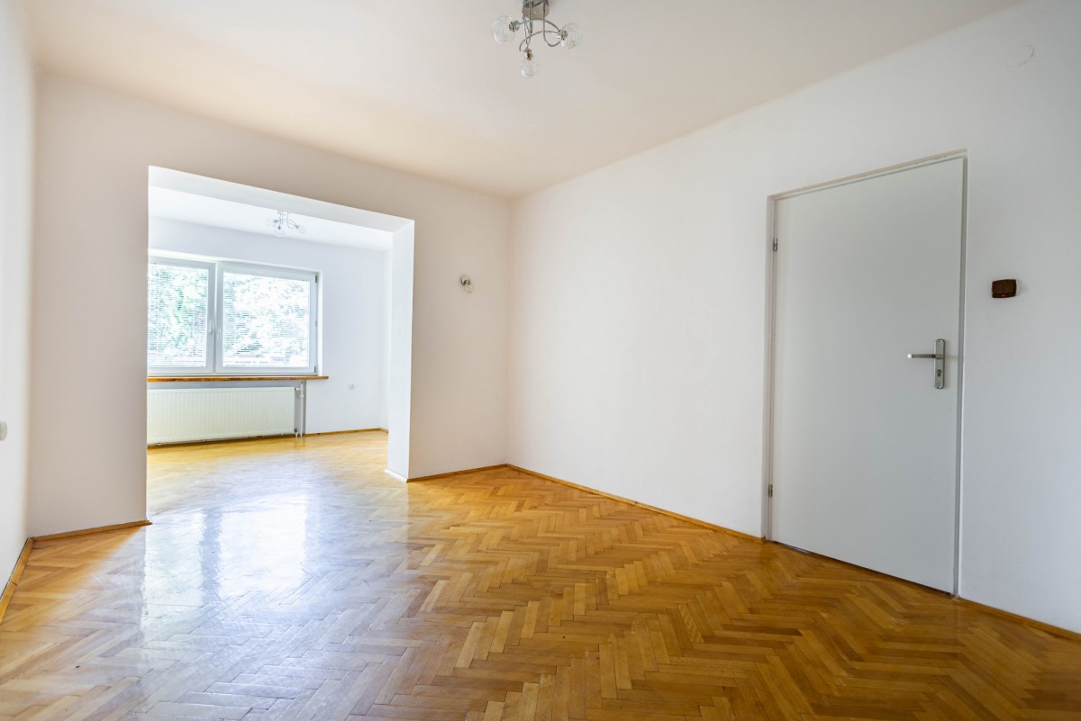Wejście do nieruchomości znajduje się od strony ogródka. Po lewej stronie od wejścia znajduje się długi korytarz, który prowadzi do wszystkich pomieszczeń. Po lewej stronie korytarza zlokalizowane są kuchnia i łazienka, a na końcu (na przeciwko wejścia) 2 duże pokoje o powierzchni po około 18m2. Największy pokój o powierzchni około 30metrów znajduje się po prawej stronie.
