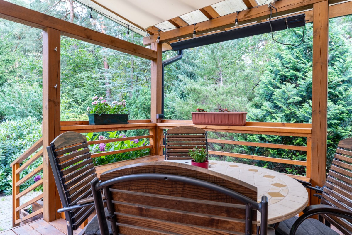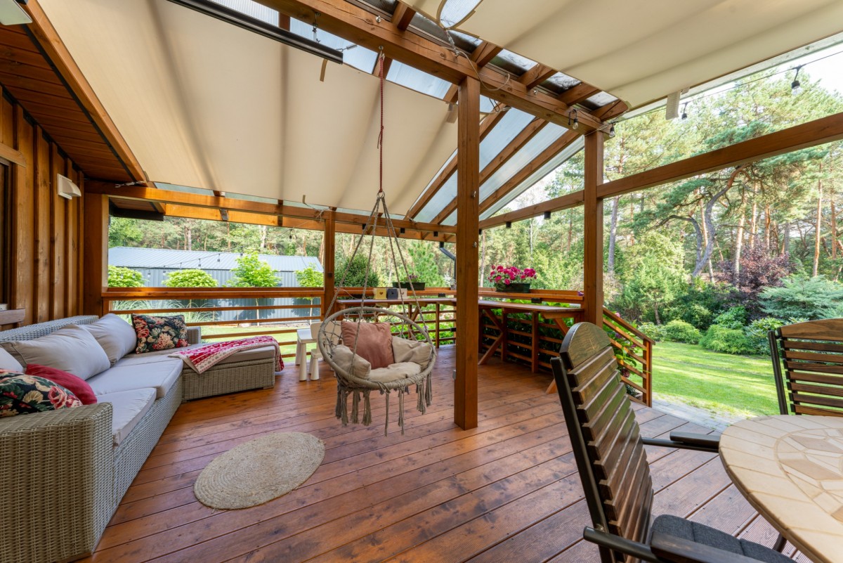 • Sercem domu jest duży, zadaszony taras - miejsce relaksu i spotkań towarzyskich, a nawet gotowania w sezonie dla przyjaciół. Zaopatrzony w panele grzewcze na podczerwień dzięki czemu można na nim przebywać o każdej pogodzie i porze dnia. Do tego wielopunktowe oświetlenie z nastrojowym działaniem - lampy LED zmieniające kolor.