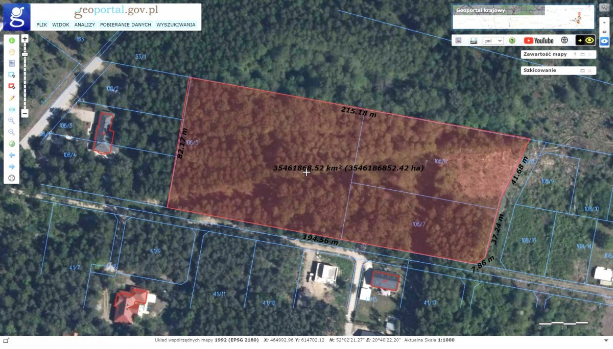 Grunt składa się z trzech działek ewidencyjnych. Dwie działki to tereny zabudowy mieszkaniowej jednorodzinnej (wolnostojącej) w terenach zalesionych wraz z częścią terenów lasów, a trzecia działka to typowe tereny lasów. Całość tworzy zwarty, foremny kompleks.