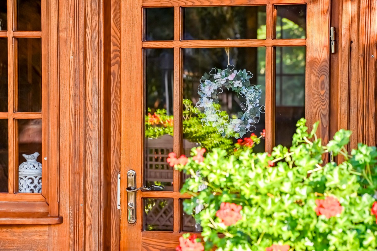 Całoroczny drewniany domek dla gości składa się z sypialni, antresoli, pokoju dziennego z aneksem kuchennym oraz łazienki. Może pomieścić 7 osób.