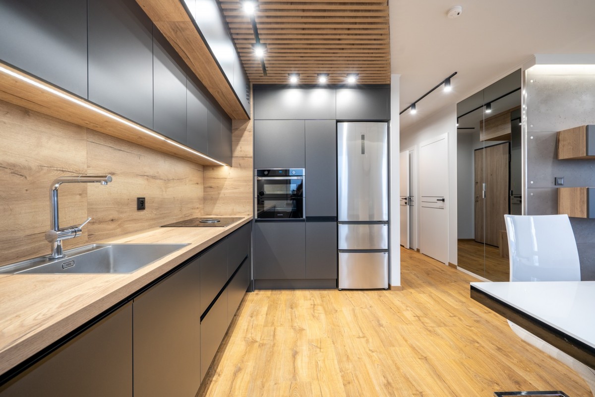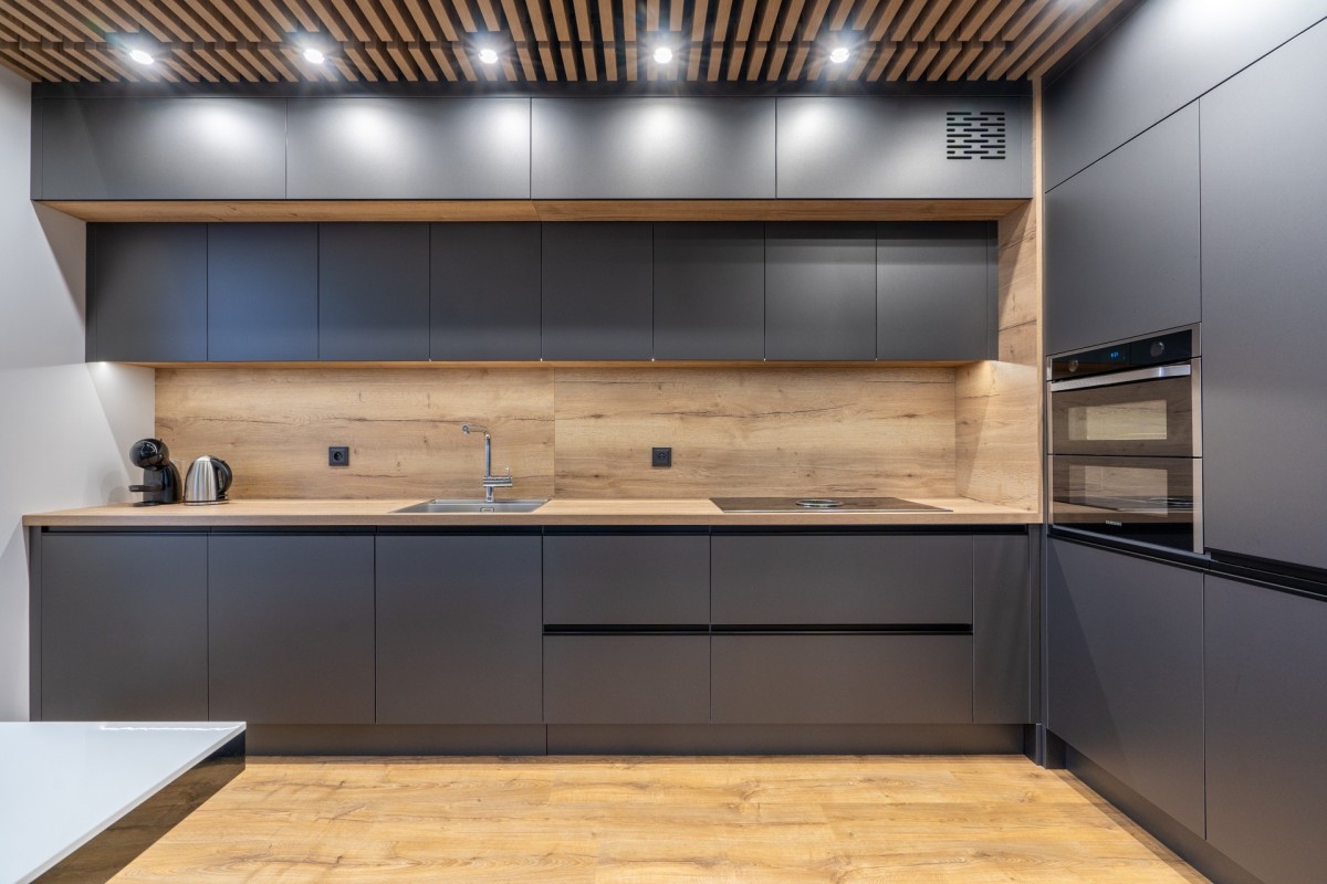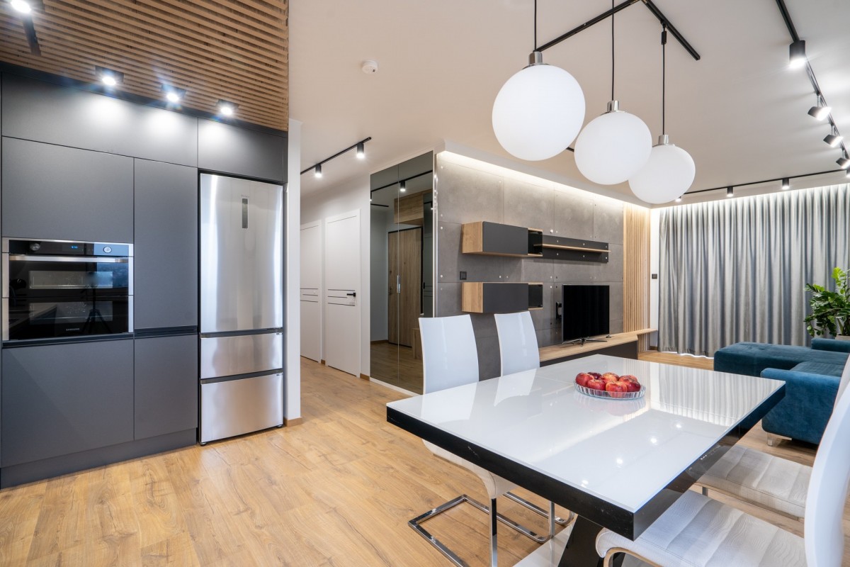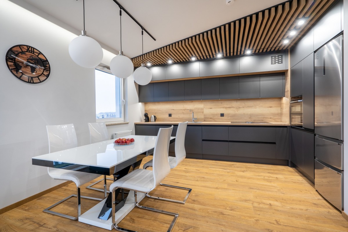 * kuchni połączonej ze strefą jadalnianą, którą wyróżnia ciekawy styl oraz rozwiązania uszyte na miarę,