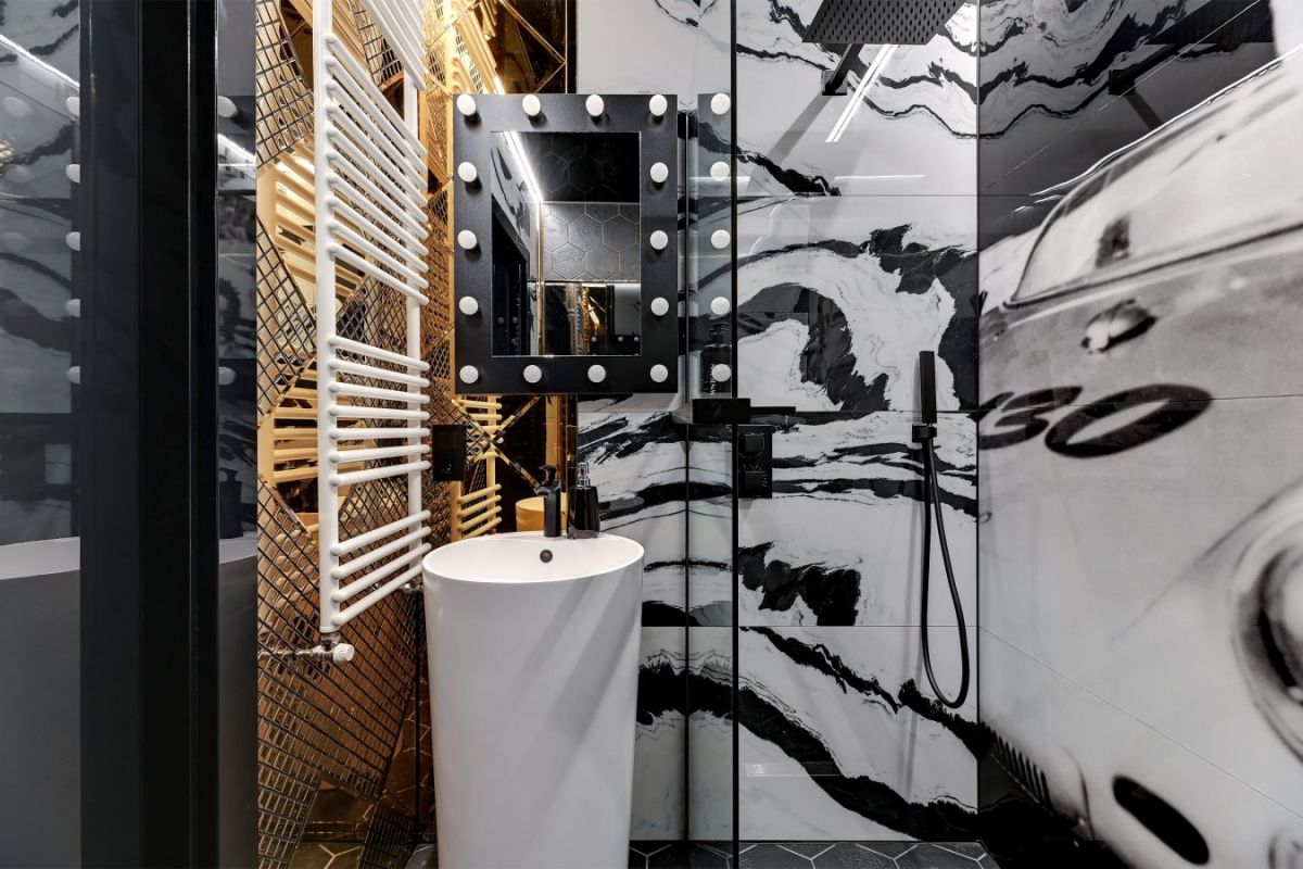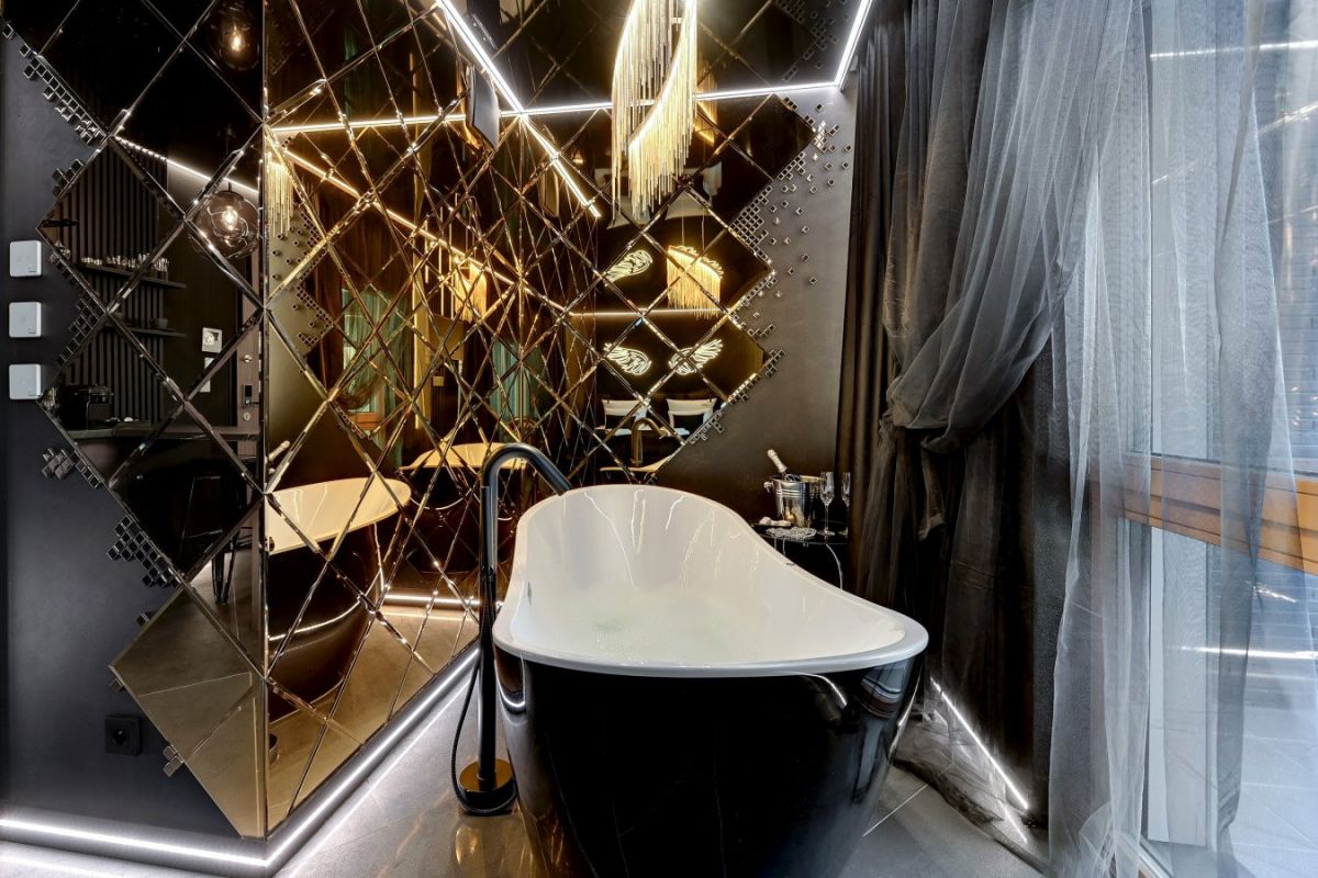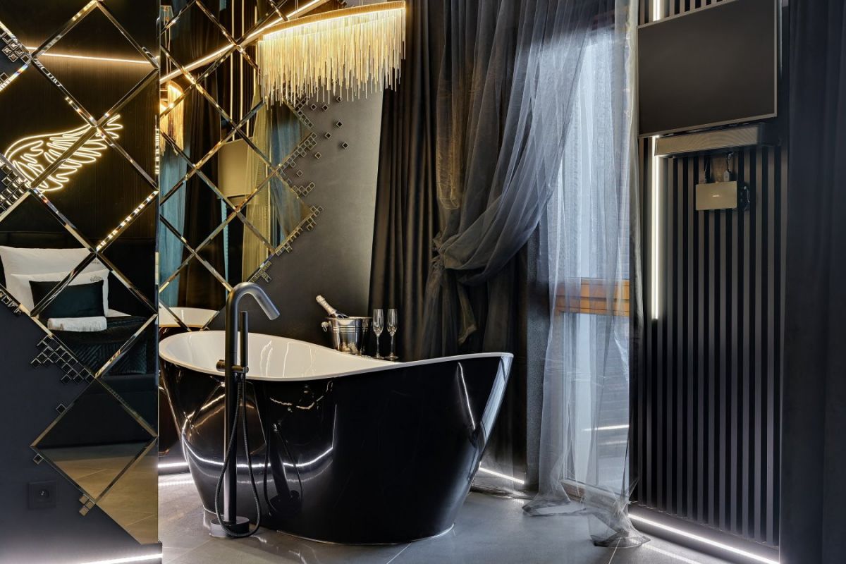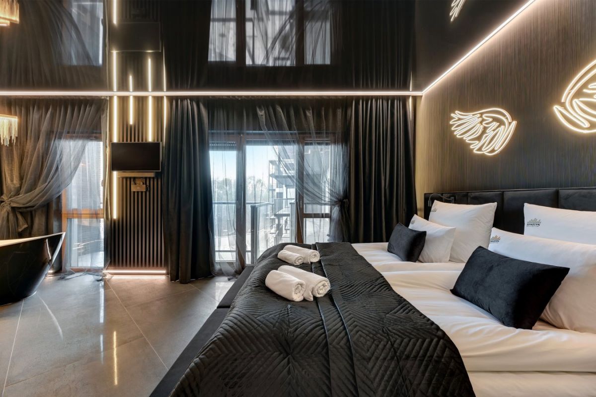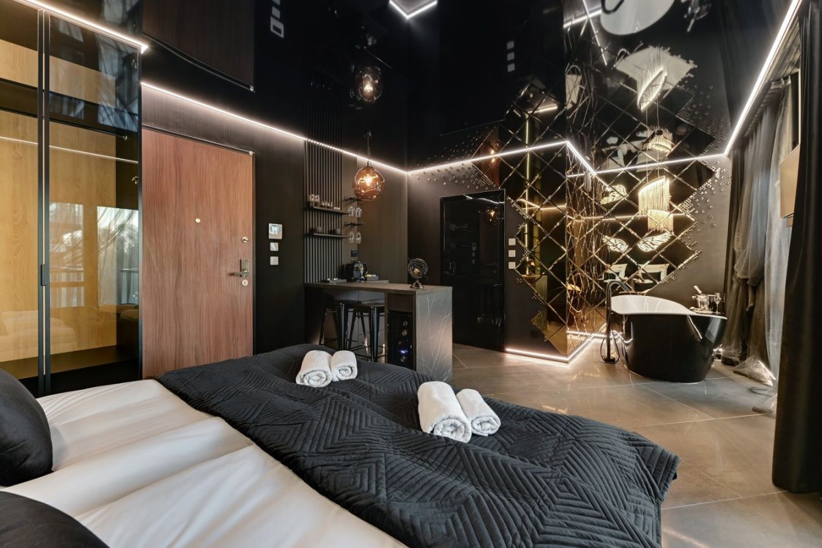 Jednym z głównych atutów tego miejsca jest ekskluzywna wanna bezpośrednio w sypialni, tworząca atmosferę relaksu i komfortu. Nowoczesne oświetlenie LED, nagłośnienie Bose oraz telewizor Samsung z technologią The Frame dodają elegancji i wyjątkowości. Sufit z folii napinanej DPS oraz podłoga z włoskiego gresu o wymiarach 150x75 podkreślają wysoki standard tego apartamentu.