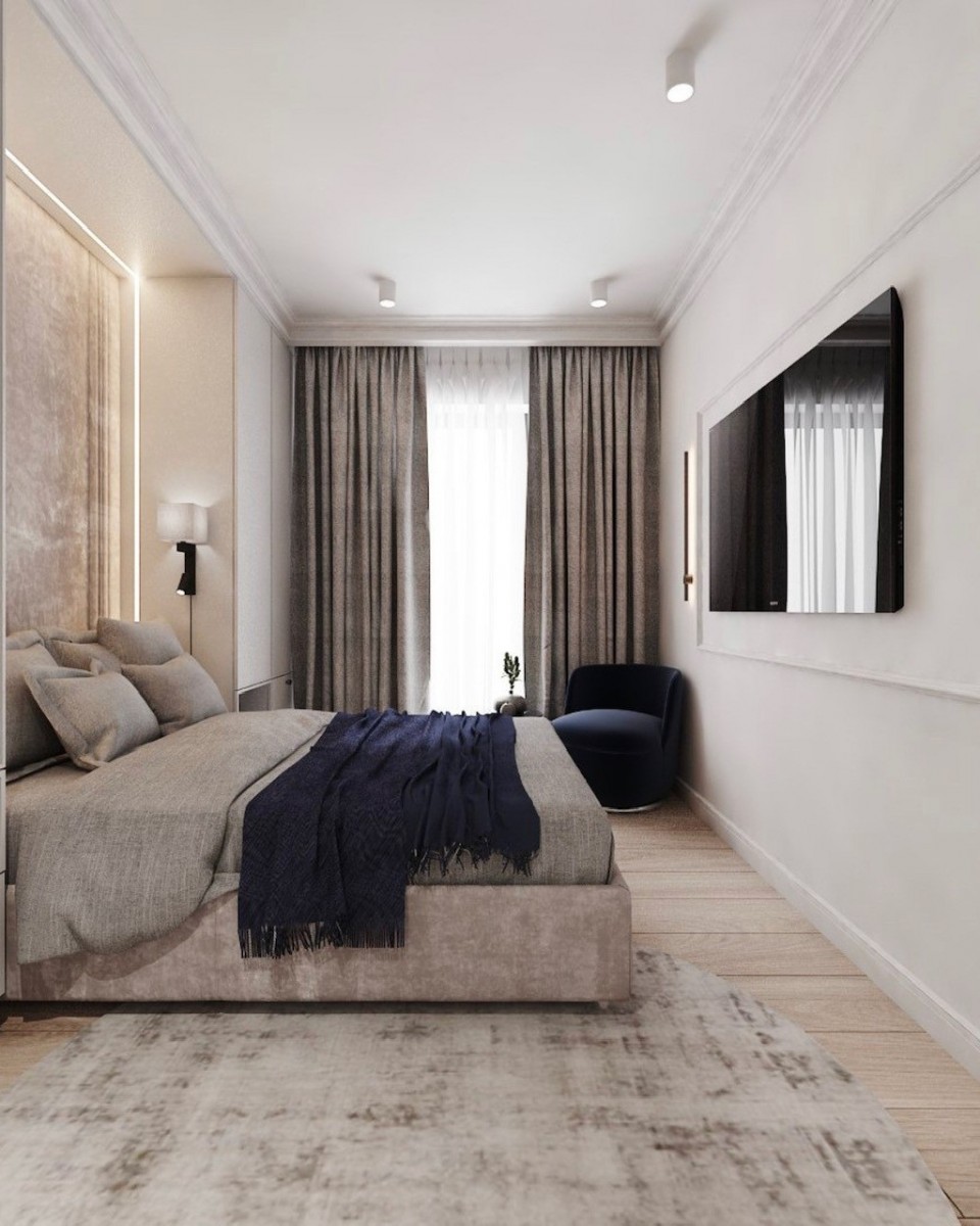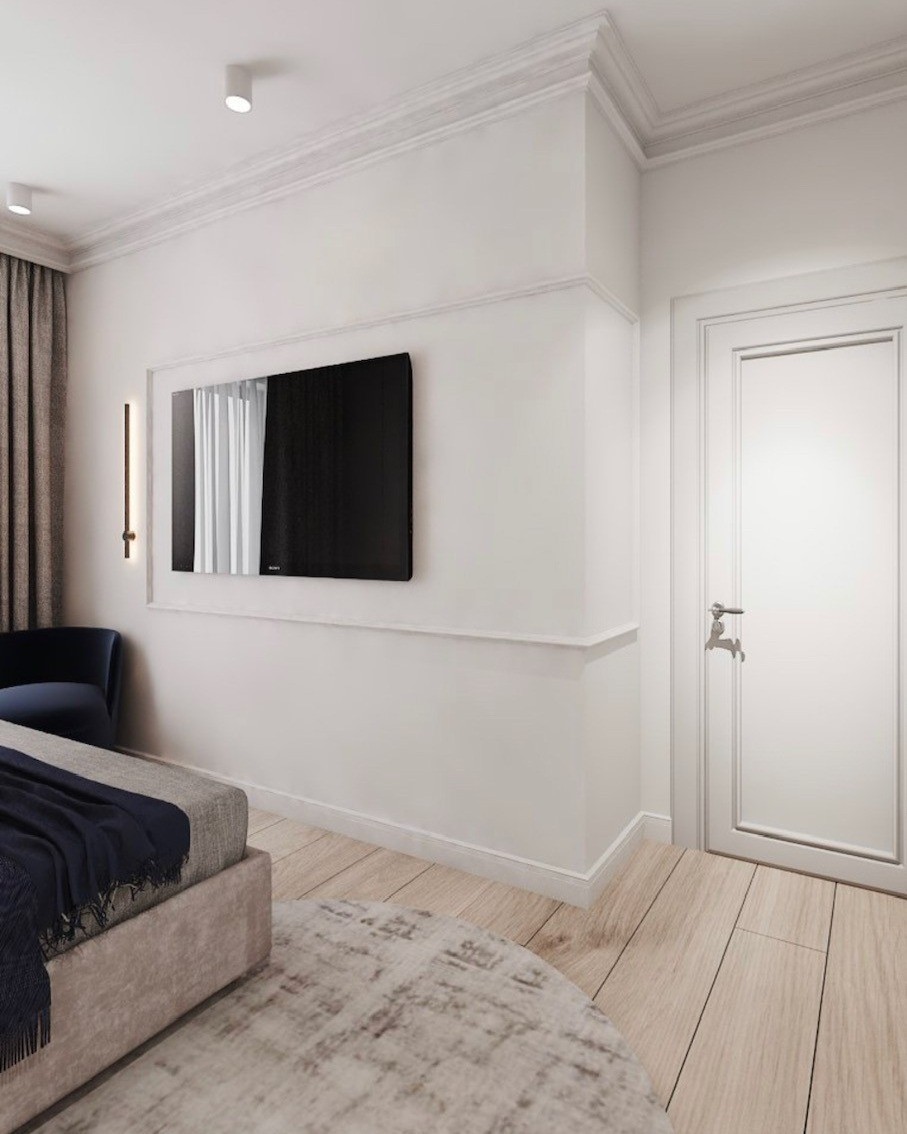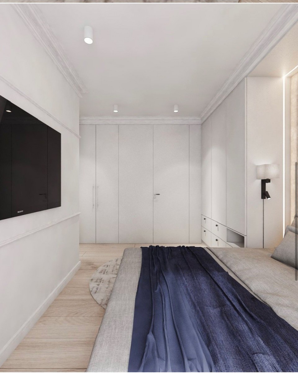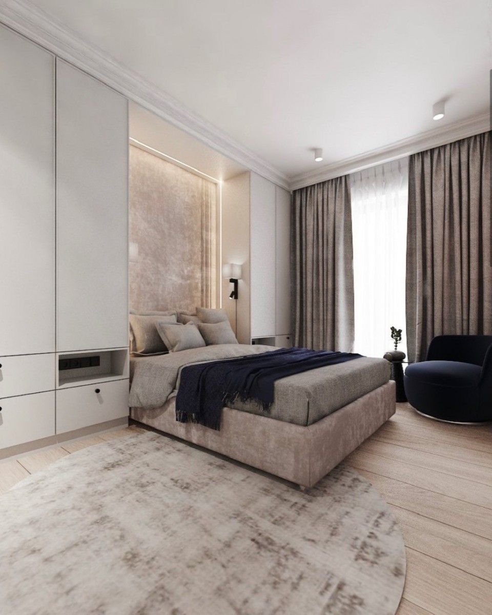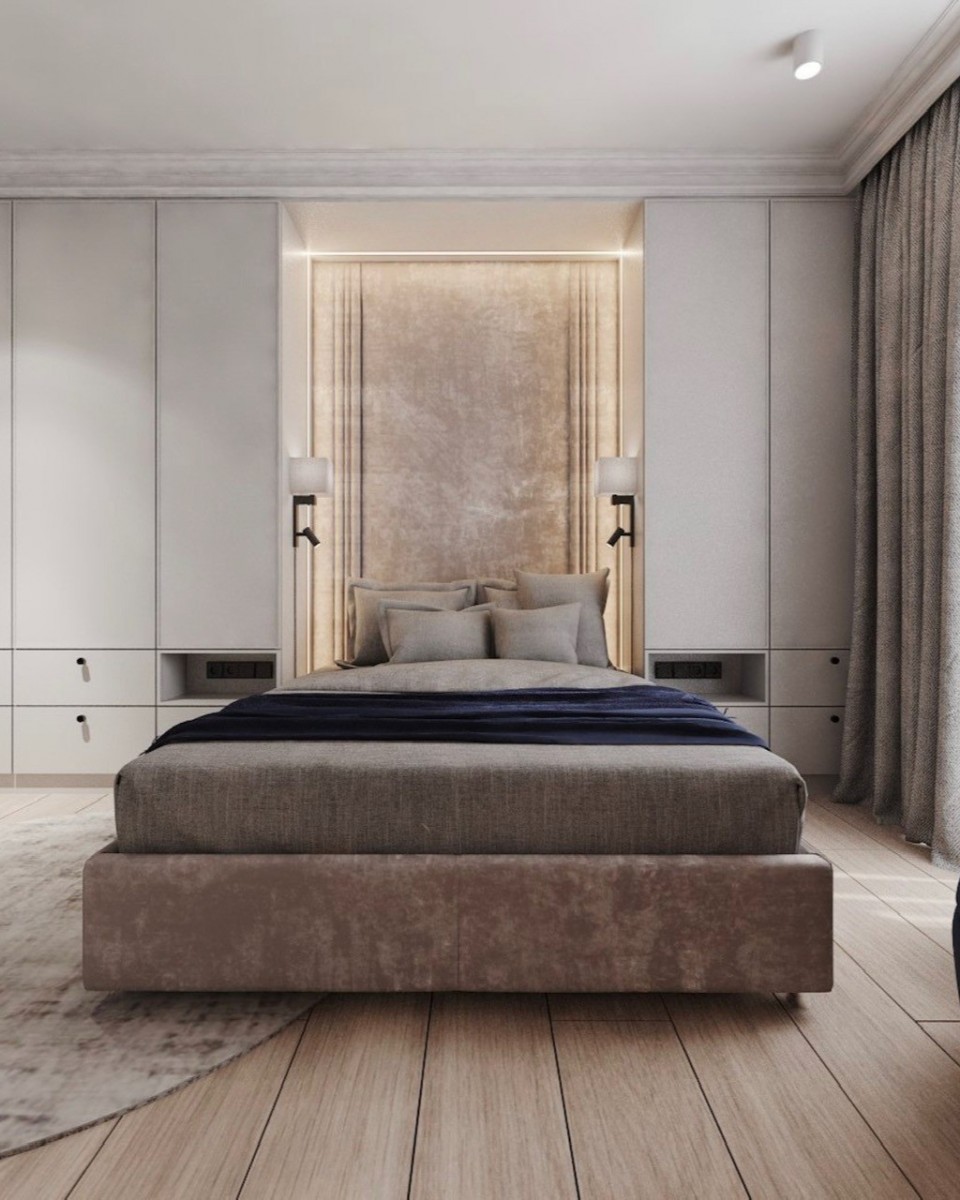 Spójna zabudowa sypialni wraz z łóżkiem kontynentalnym, idealnie wkomponowana w całą stylistykę mieszkania.