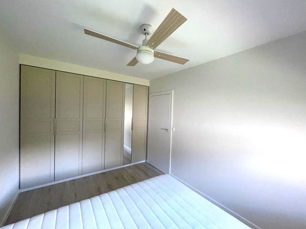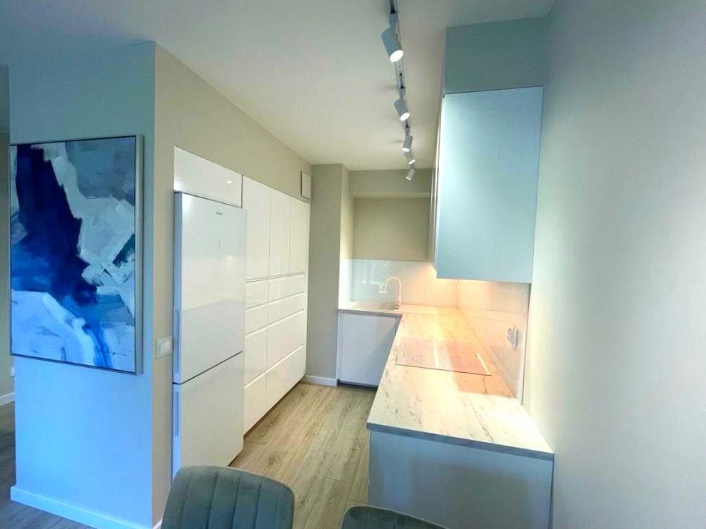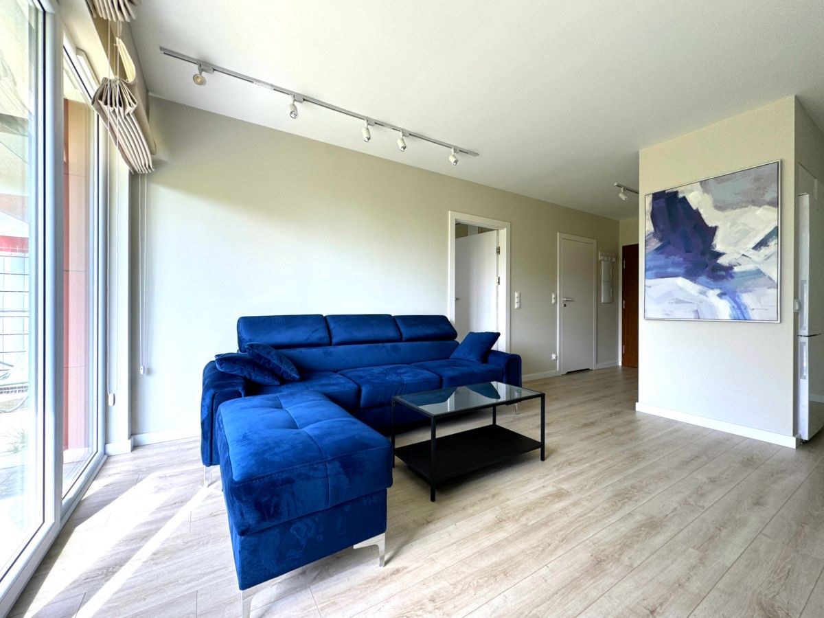 Apartament składa się z salonu z przestrzenią wypoczynkową i 65" telewizorem wraz z otwartą kuchnią, całkowicie wyposażoną w nowoczesne sprzęty, w tym lodówkę, piekarnik, płytę ceramiczną i zmywarkę oraz modną zabudowę w kolorze białym z wysokim połyskiem. W pięknie urządzonej i wyposażonej w stałą zabudowę sypialni znajduje się sufitowy wentylator, który zapewnia komfort w upalne dni. Piękna łazienka wyposażona jest również w zabudowę stałą, prysznic, umywalkę i misę WC. W niedużym holu wyjściowym także zmieszczono dużej rozmiarów zabudowę służącą przechowywaniu. Okna wyposażono w eleganckie rolety rzymskie, a cały apartament jest bardzo jasny i ciepły.