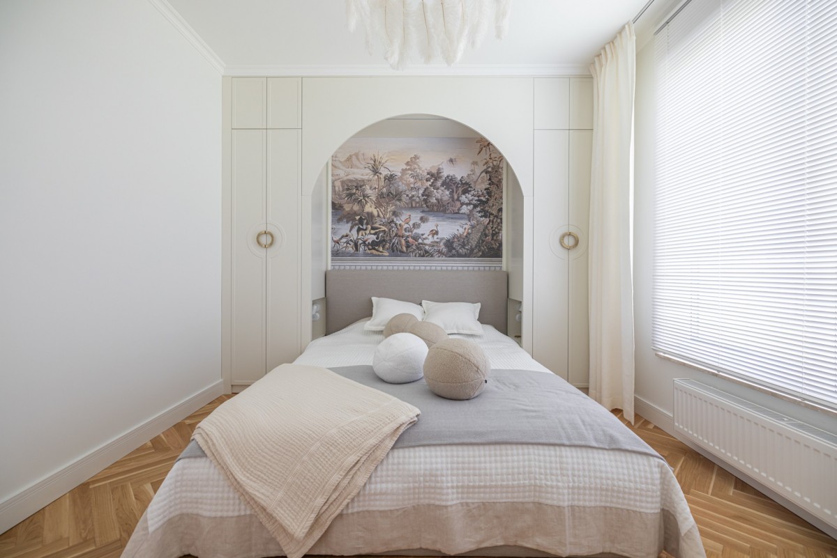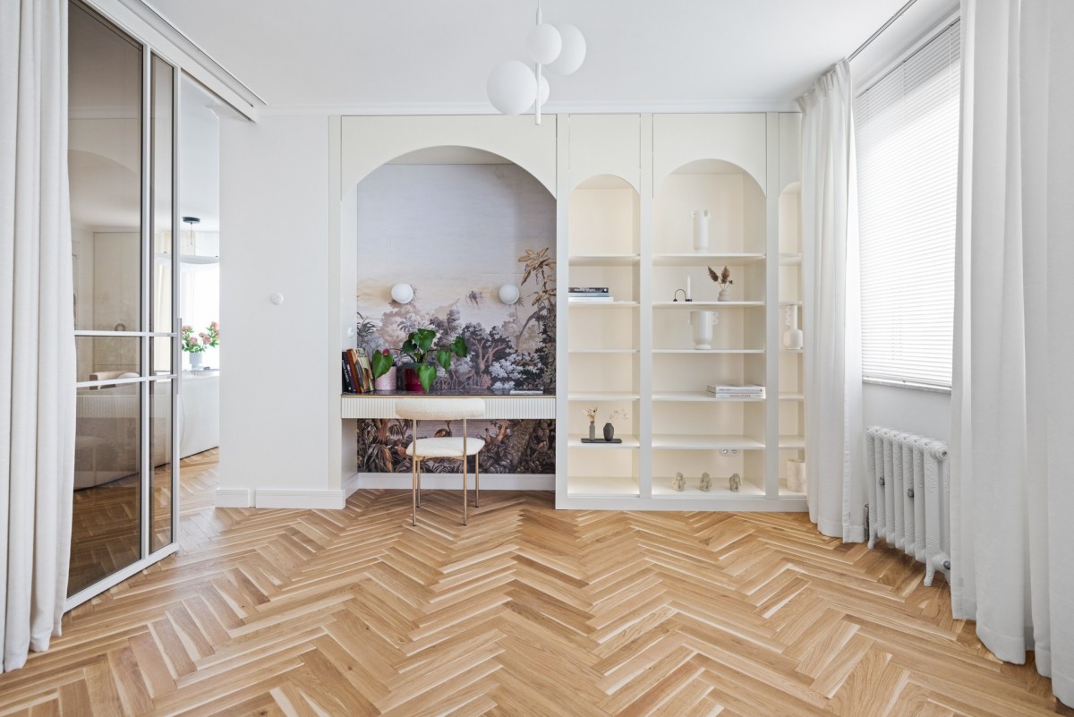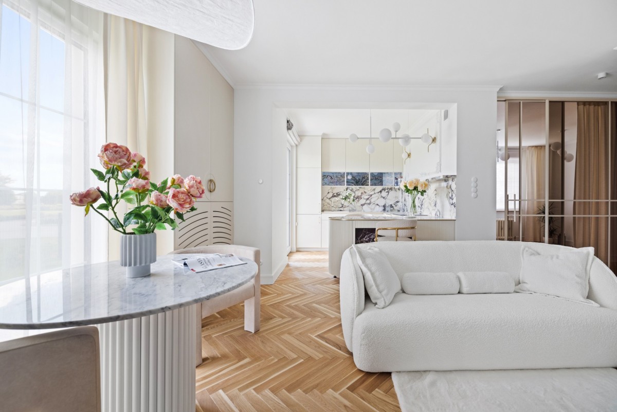 Apartament zaprojektowany i zaaranżowany przez znaną trójmiejską architekt. Jego wnętrze koreluje z otaczającymi ogrodami Tesoro. Klasyczne, funkcjonalne i ponadczasowe zachowuje równowagę między historią a współczesnością. Między luksusem a minimalizmem. Jasna aranżacja wnętrz idealnie koresponduje z tropikalnymi dekorami. Odnajdujemy tu przepiękne kafle i tapety na zamówienie, szlachetne materiały, takie jak kolorowy marmur czy jasny dąb na podłogach. Jasna zabudowa kuchenna, która poza swoją funkcjonalnością dekoruje mieszkanie. Meble na zamówienie i klimatyczne oświetlenie podkreślają styl wnętrza.