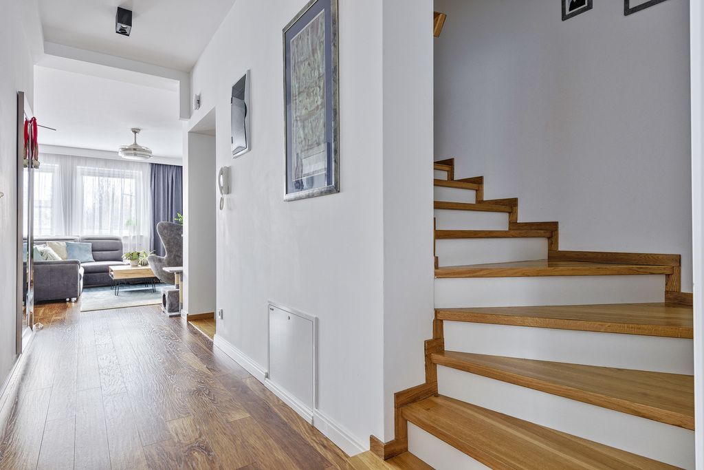 Ten unikalny segment został przemyślany w każdym detalu i ma niebywale dużo udogodnień dla domowników. Cały wystrój i wyposażenie wnętrza jest praktycznie nowe- użytkowane przez właścicieli zaledwie 2,5 roku. Piękne podłogi, przestronne pokoje, klimatyzacja na każdej kondygnacji, elektryczny kominek w konsoli, podświetlone schody i aranżowane oświetlenie ledowe, wanna z hydromasażem, dwa balkony, elektryczna markiza, filtr do wody na kranie, instalacja antywłamaniowa w każdym pomieszczeniu i wiele, wiele innych.