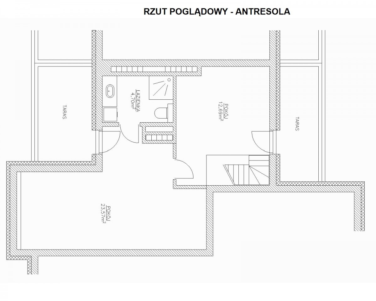 ANTRESOLA: łazienka, pokój, otwarty salon. Z tego poziomu jest wyjście na 2 tarasy.