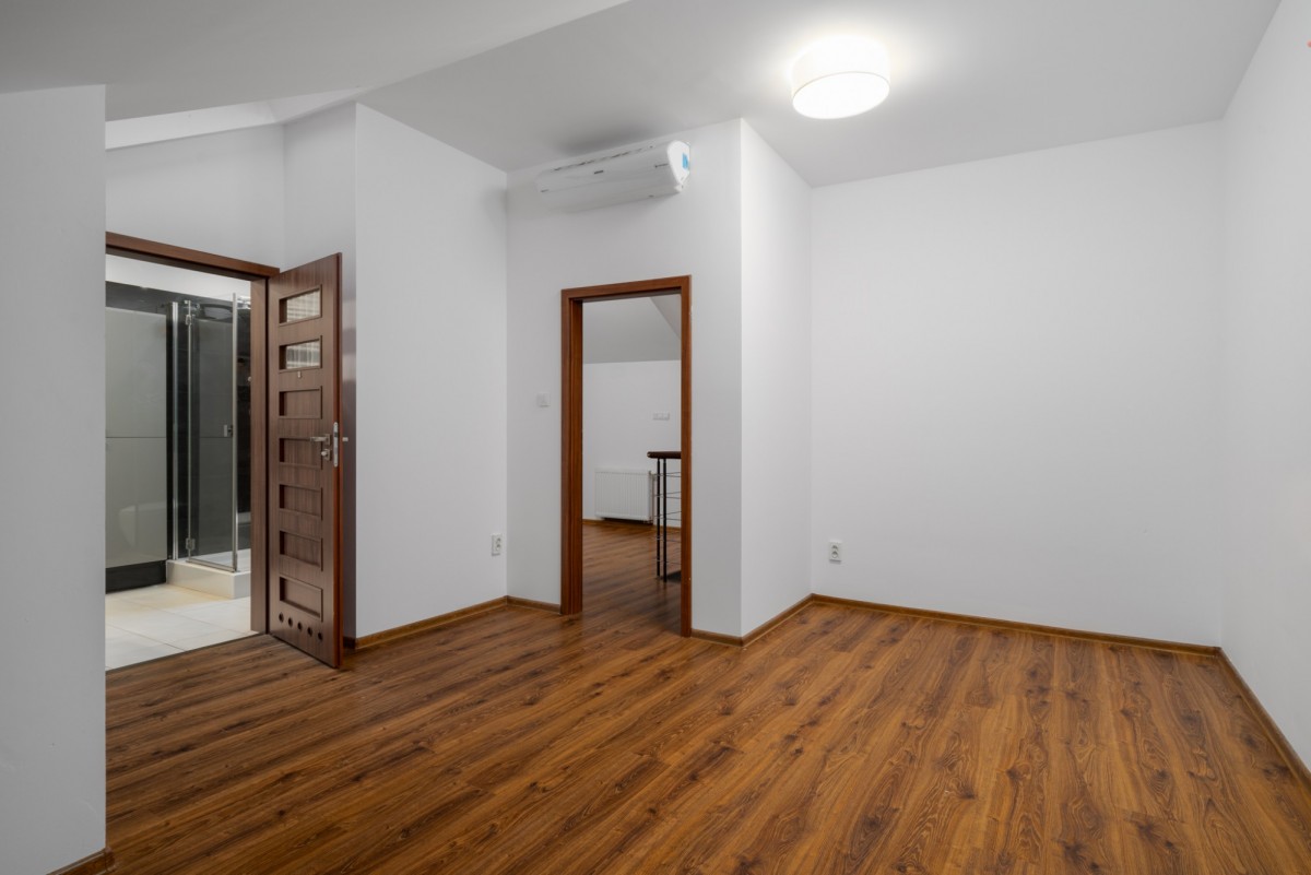 2 pokoje, które mogą pełnić funkcje sypialni albo gabinetów do pracy. Jeden pokój z wyjściem na balkon. Łazienka z wanną, przedpokój z zabudową