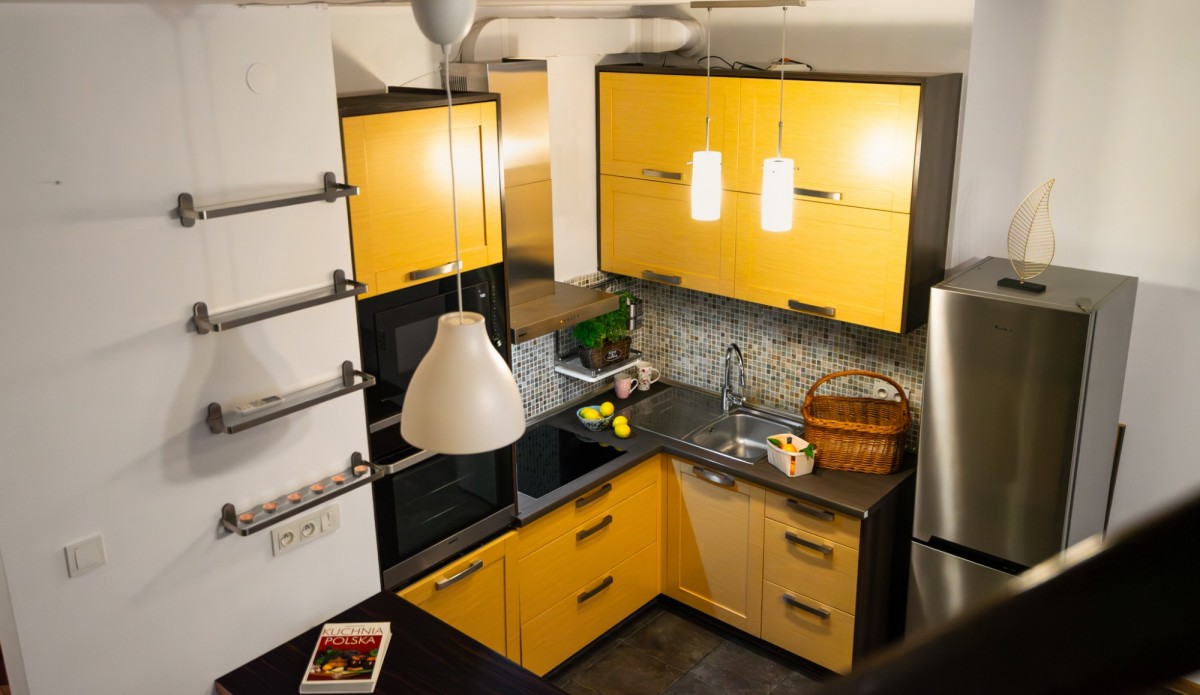 Kuchnia z meblami w zabudowie, sprzęt AGD (zmywarka, piekarnik, Okap, lodówka).