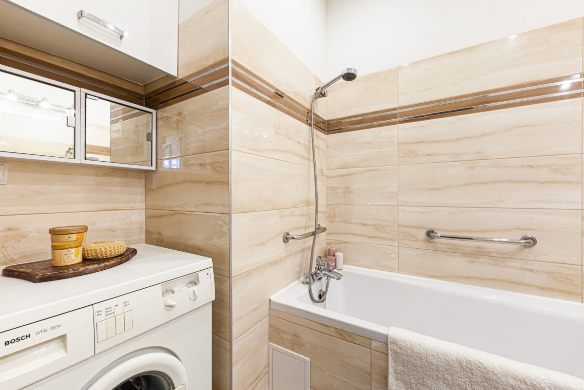 Mimo niewielkich rozmiarów, łazienka ta jest wyjątkowo funkcjonalna. Zintegrowany z umywalką blat, wyposażony w szafki, umożliwia przechowywanie kosmetyków i akcesoriów łazienkowych. Idealna dla tych, którzy cenią sobie estetykę połączoną z praktycznością.