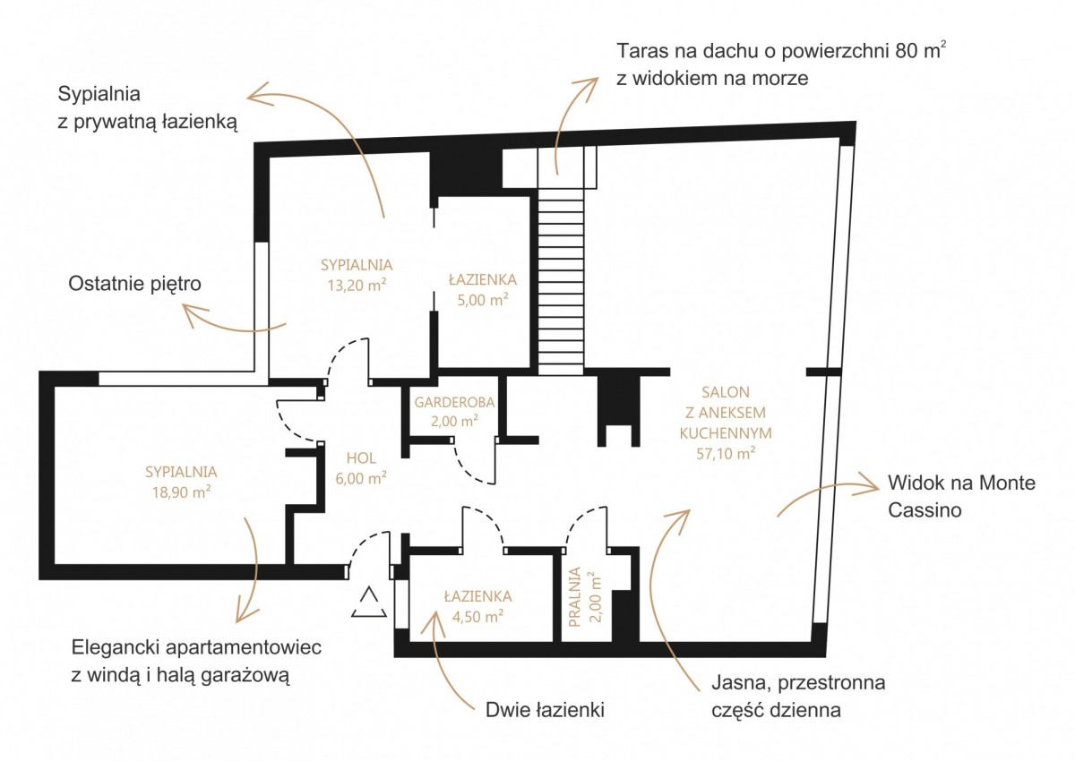 Przestronna nieruchomość o pow. 112,34 m2, położona na ostatnim, 3 piętrze. Apartament składa się z dużej części dziennej z kominkiem, dwóch sypialni, w tym jedna masterbedroom oraz łazienki i przedpokoju. Z salonu prowadzą schody na prywatny taras widokowy o pow. 84,85 m2, gdzie znajduje się przestrzeń do wypoczynku. Apartament został wykończony w 2017 roku, jest w pełni wyposażony, utrzymany w nadmorskiej stylistyce, w pełni klimatyzowany. Nieruchomość jest doskonałą propozycją dla osób poszukających wakacyjnego apartamentu, wyjątkowego miejsca do życia, czy inwestycji z pewnym wzrostem wartości.