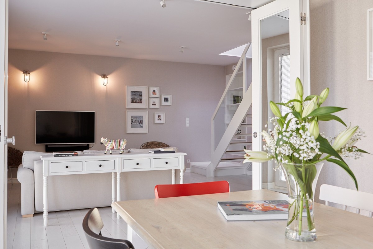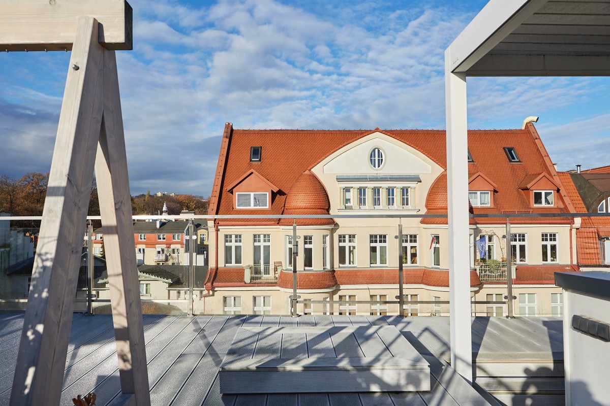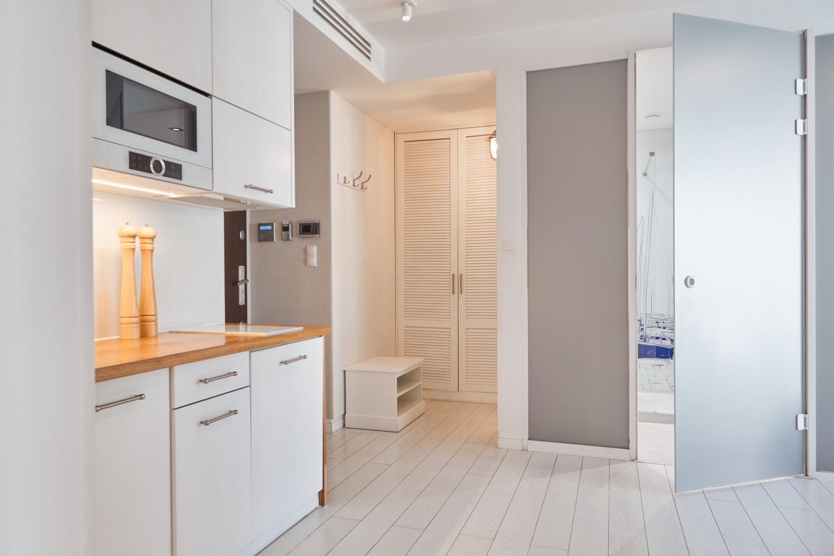 Elegancki, wysokiej klasy apartamentowiec. Apartament w prowansalskim klimacie. Taras widokowy na dachu z widokiem na morze oraz sopockie kamienice.