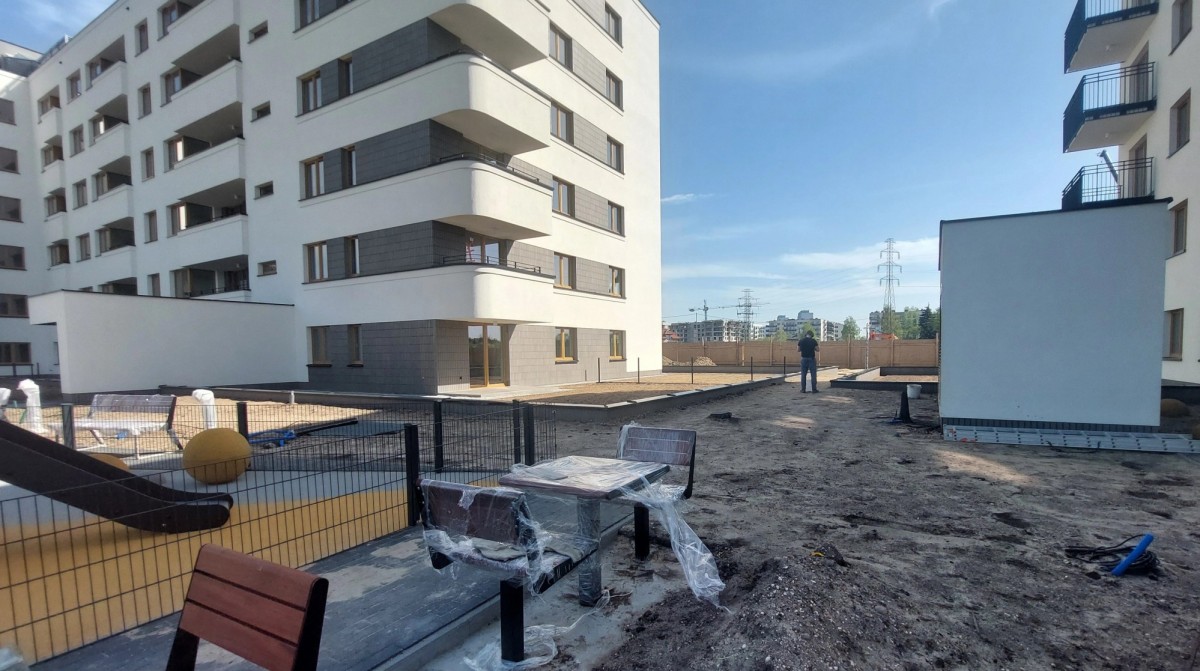 Na zewnątrz budynków zaprojektowano przestrzeń z placem zabaw, ławkami, stojakami rowerowymi oraz budkami dla ptaków i domkami dla owadów, piękną zieleń w formie żywopłotów, pergoli i roślin pnących.
