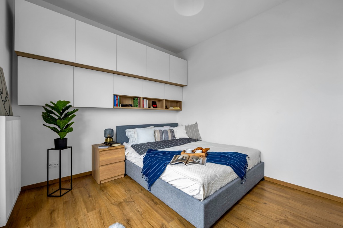 Wszystkie pomieszczenia w mieszkaniu charakteryzują się wysokim standardem wykończenia. Podłogi pokryte są wysokiej klasy panelami, a duże okna zapewniają doskonałe doświetlenie każdego z pokoi. Mieszkanie jest wyposażone w klimatyzację, co jest dodatkowym atutem podczas cieplejszych dni.