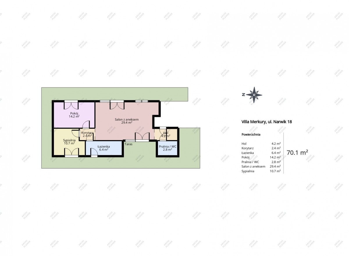 Mieszkanie o powierzchni 71m2 charakteryzuje się nowoczesnym rozkładem, obejmującym trzy ustawne pokoje, łazienkę, dodatkowe pomieszczenie gospodarcze przystosowane do roli pralni lub drugiej łazienki oraz imponujący taras o powierzchni 61m2. Dzięki przemyślanemu projektowi, każde pomieszczenie (nawet łazienka!) oferuje dostęp do ogromnego tarasu, umożliwiając cieszenie się widokiem na okolicę oraz nieograniczone możliwości aranżacyjne.