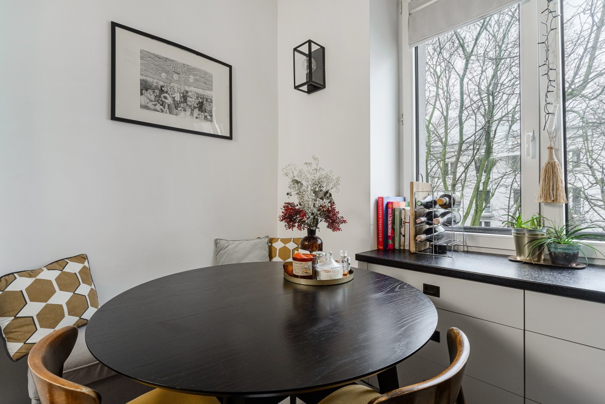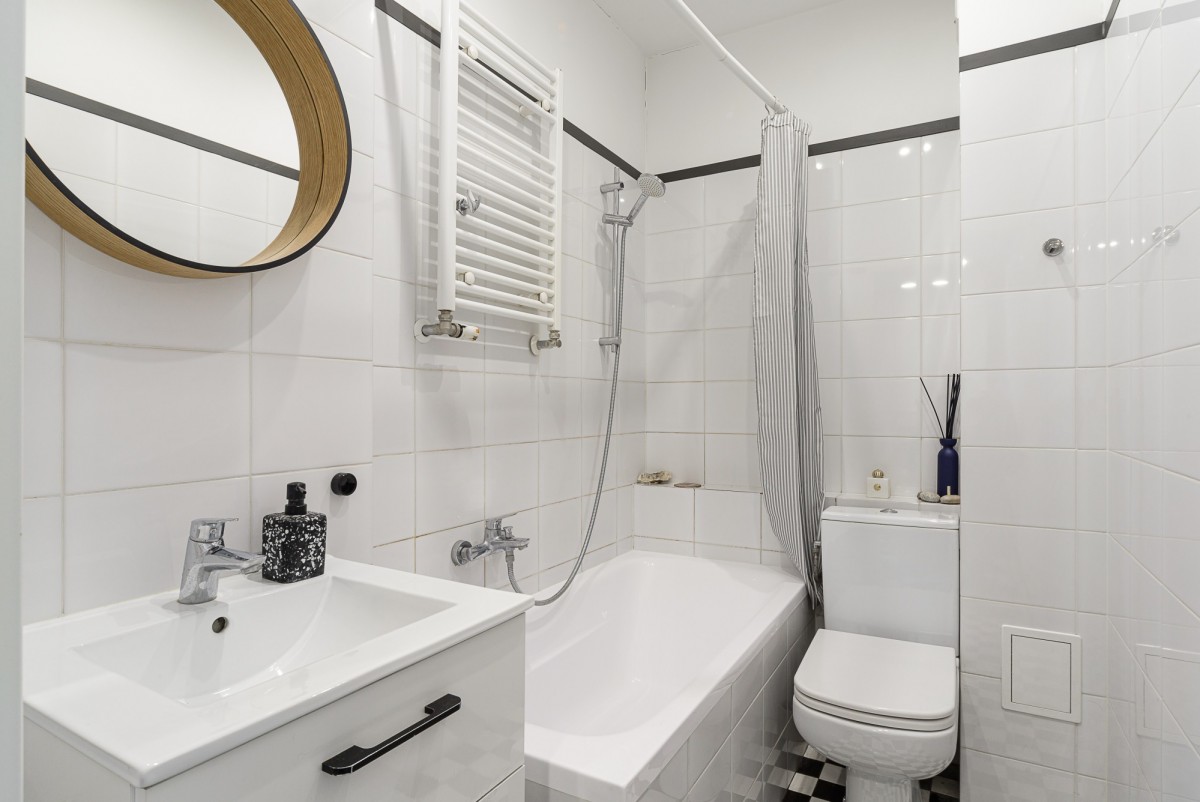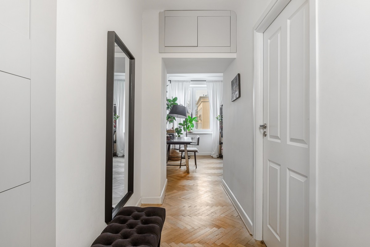 Na podłodze pozostawiony drewniany parkiet w dobry stanie, nadając dodatkowego klimatu. Wszystkie okna z mieszkania wychodzą na ciche i zazielenione podwórko, a samo mieszkanie jest narożne wiec graniczy tylko z jednym mieszkaniem na piętrze.