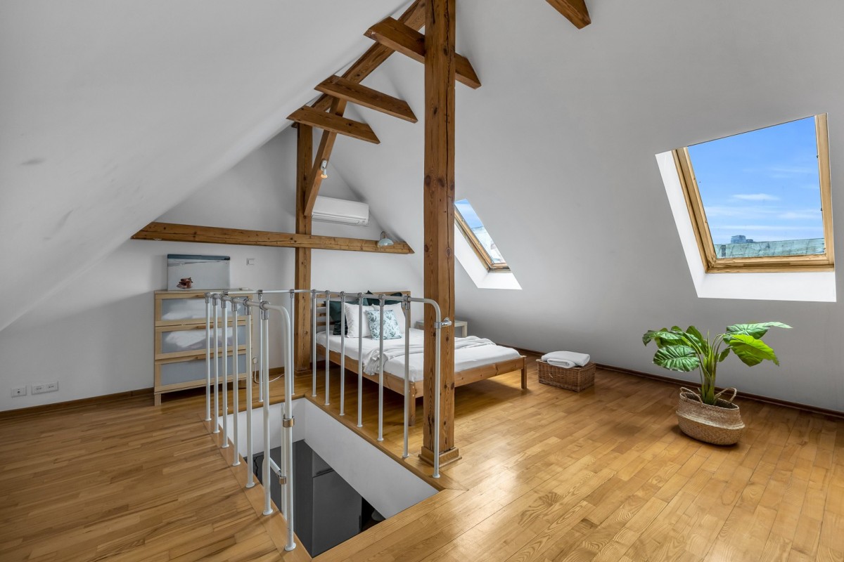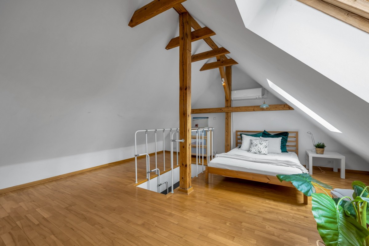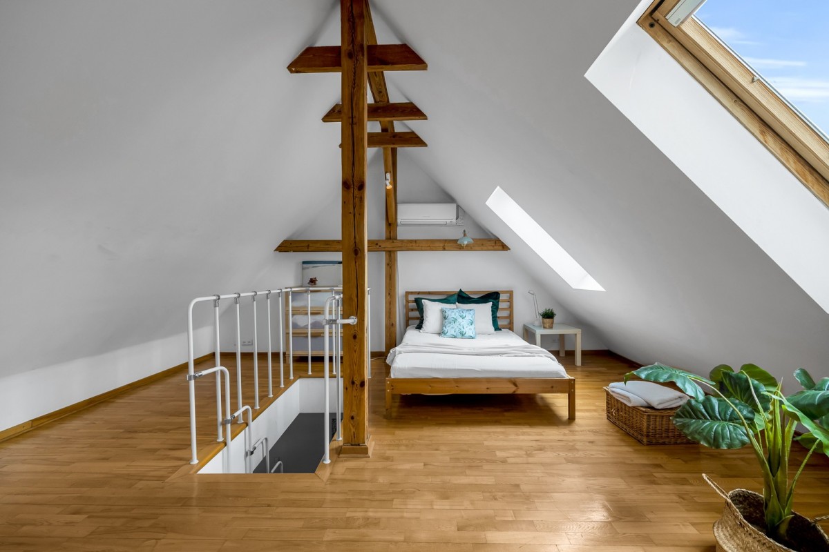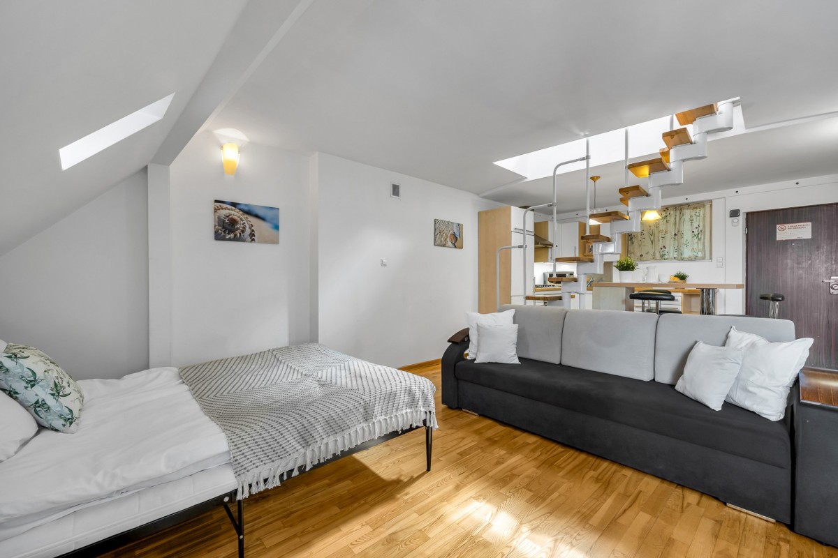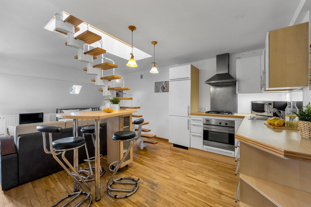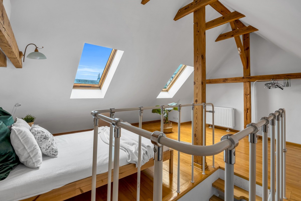 Mieszkanie rozkłada się na dwóch piętrach, co dodaje mu charakteru i wyjątkowego uroku.