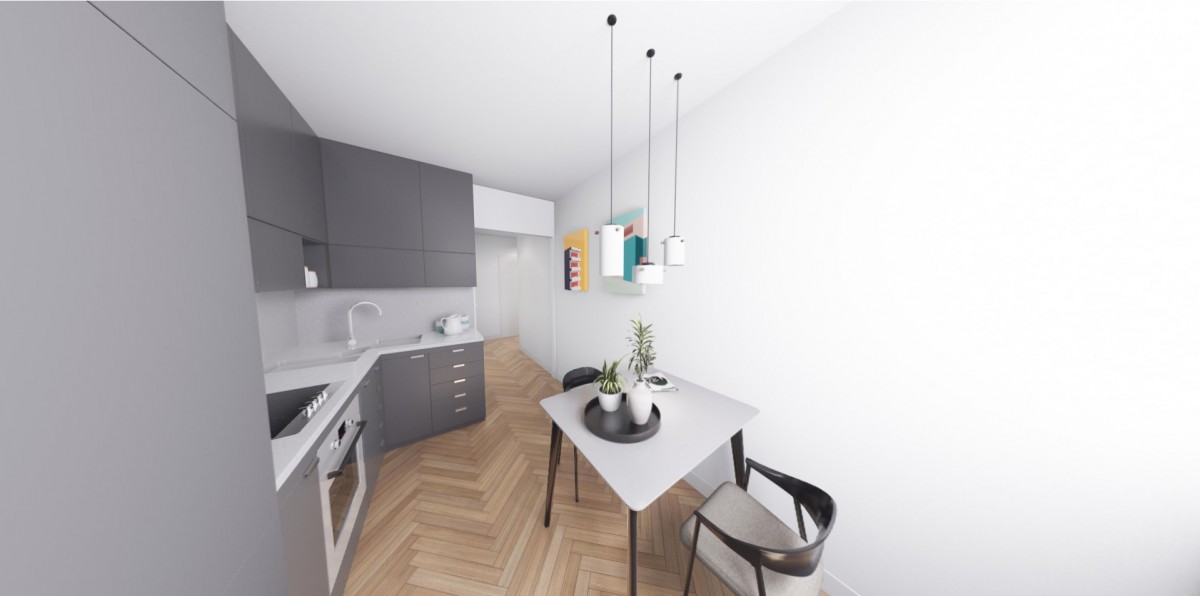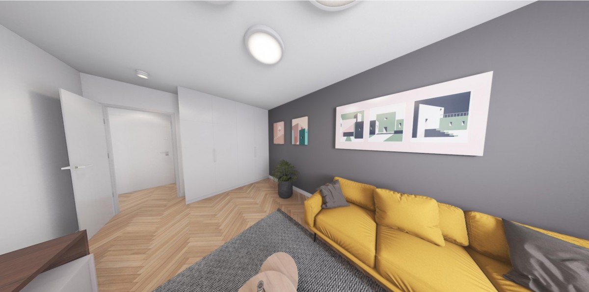 Grafika stanowi wirtualny projekt wykończenie wnętrza z zachowaniem realnych wymiarów przestrzeni i umeblowania.