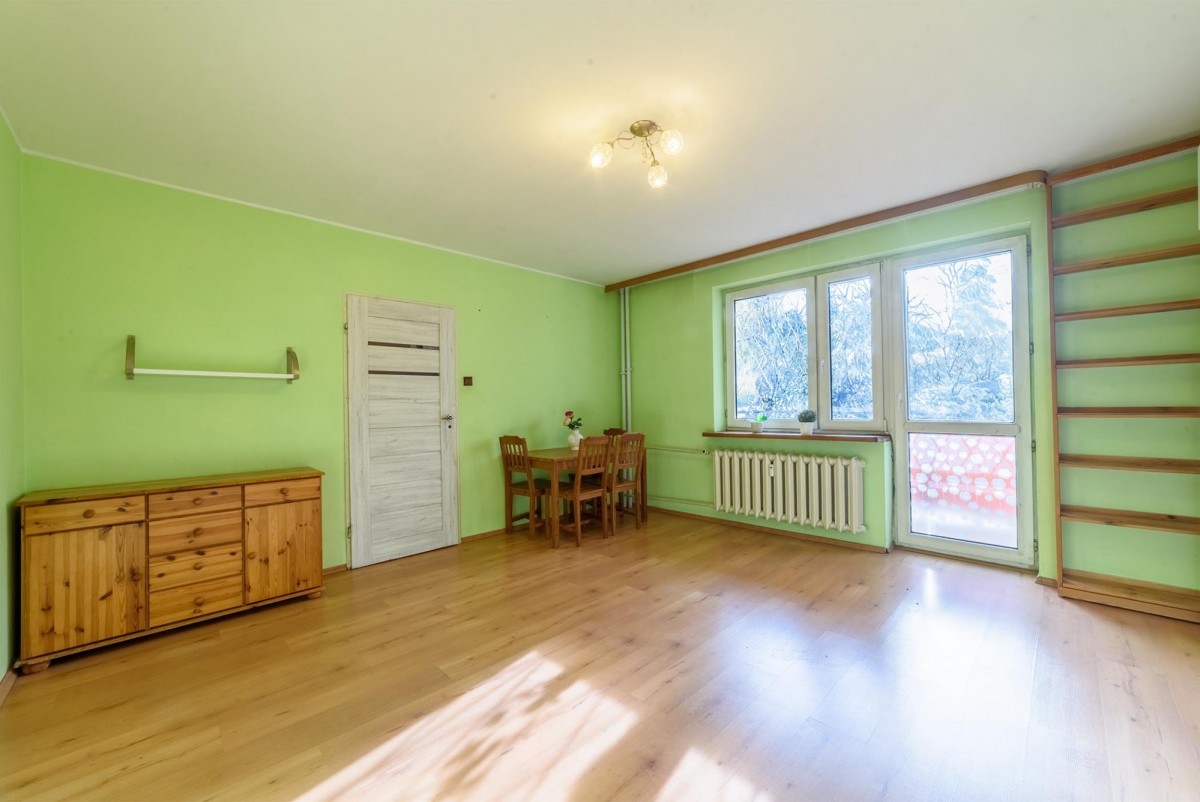 Z salonu jest wyjście na dużą loggię 7 m2. Loggia i ekspozycja okien na stronę południową. Z okien widok na drzewa i ładnie zagospodarowaną zieleń na osiedlu. Pomieszczenia są bardzo widne.