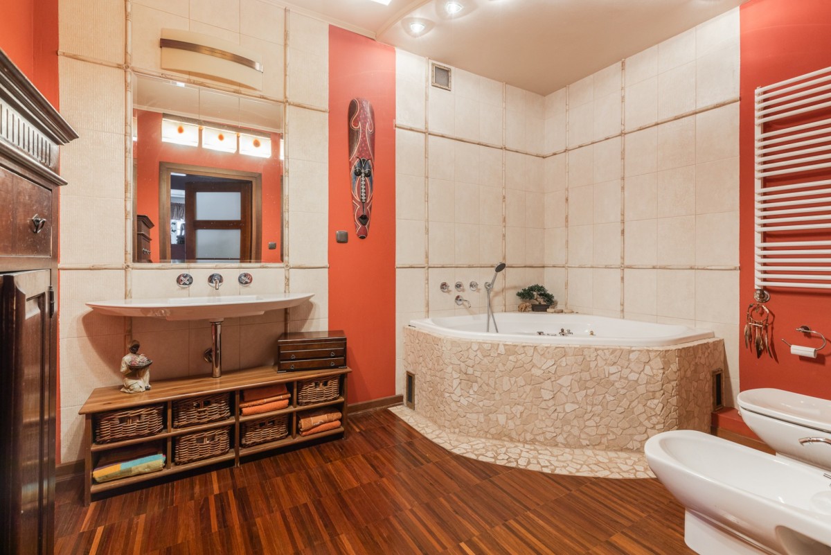 Następnie pierwsze drzwi po prawej to przestronny pokój kąpielowy, z narożną wanną, nad którą znajduje się klimatyczne oświetlenie w sam raz na wieczorne odprężenie.