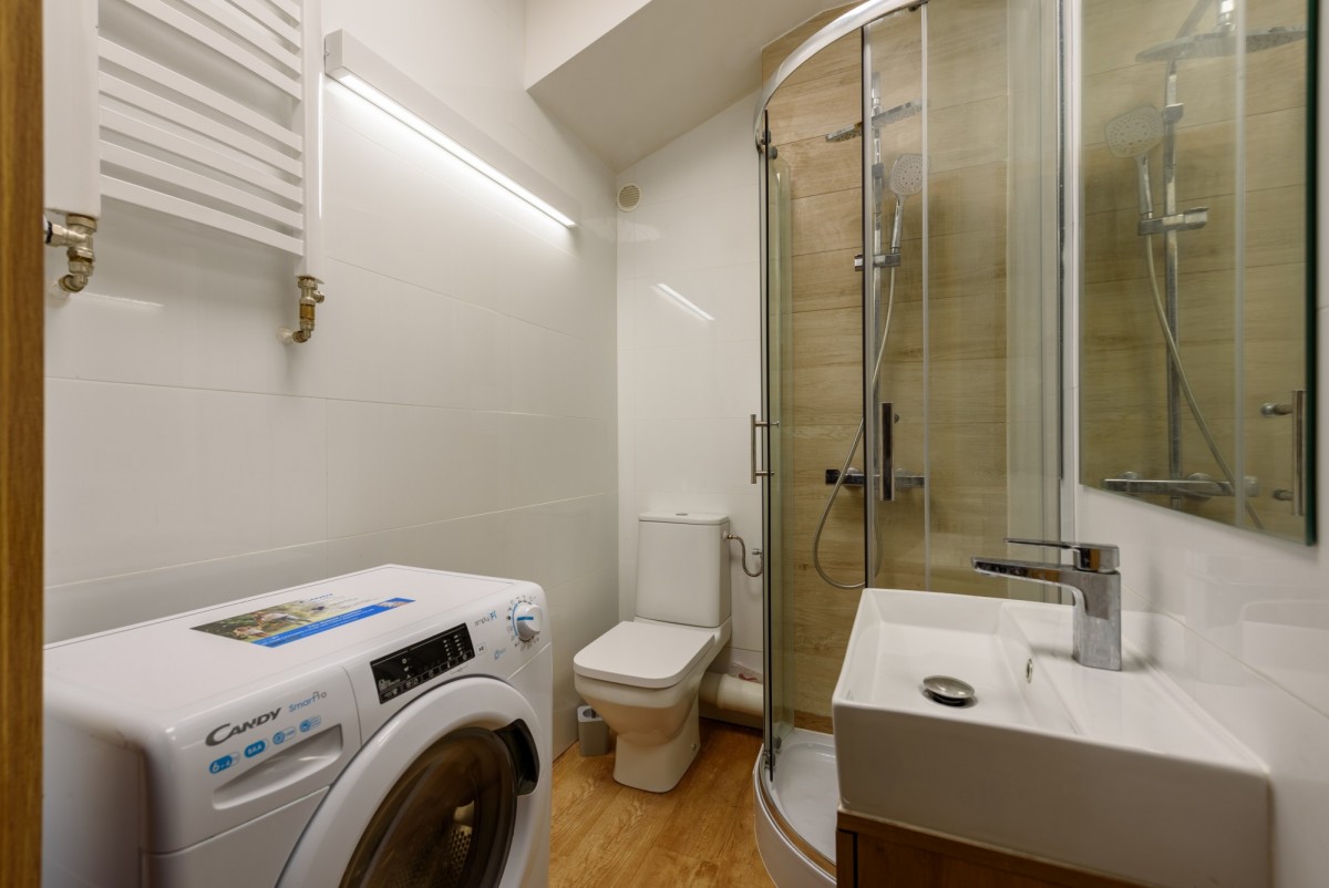 W kuchni lodówka, zmywarka, okap, płyta elektryczna, piekarnik z funkcją mikrofali i z termo obiegiem oraz gotowaniem na parze, zlew, pralko-suszarka. Meble na wymiar- w zabudowie.